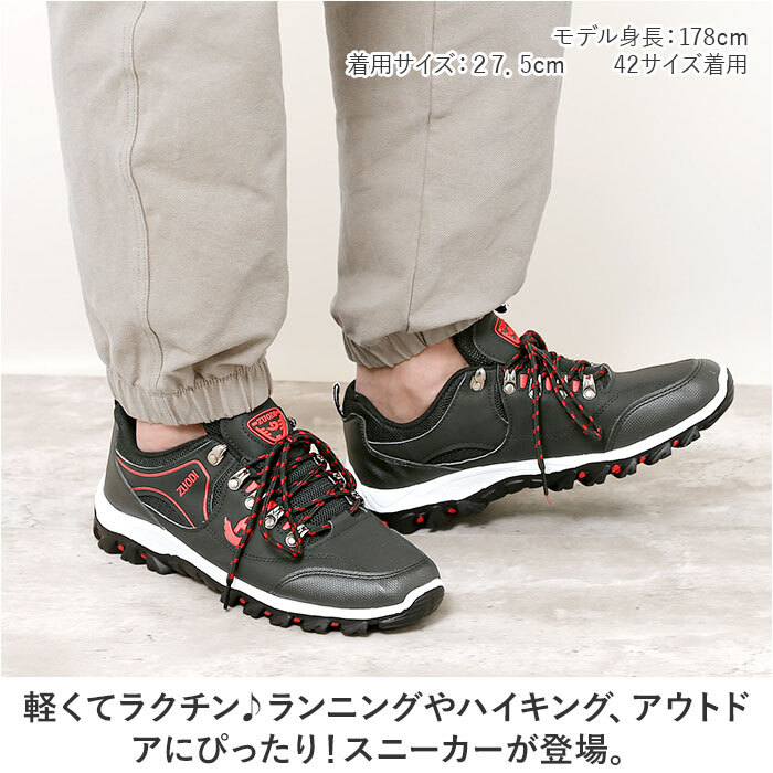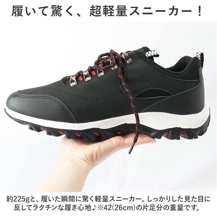 商品説明 | ・・軽くてラクチン♪ランニングやハイキング、アウトドアにぴったり!スニーカーが登場。 ・【履いて驚く、超軽量スニーカー!】 ・約225gと、履いた瞬間に驚く軽量スニーカー。しっかりした見た目に反してラクチンな履き心地♪ ・※42(26cm)の片足分の重量です。 ・【アクティブシーンにぴったり!】 ・頑丈な作りと滑りにくいソールで、ランニングやハイキング、アウトドアなどレジャーで大活躍! ・【着脱しやすく動きやすい◎】 ・プルタブ付で脱ぎ履きがしやすく、靴紐をキュッと絞ればフィット感が抜群!動きやすさが魅力◎ ・【ムレにくいメッシュ仕様】 ・アッパーの一部にはメッシュ素材を使用。汗や湿気を逃してくれるので、ムレにくく快適! ・【エイジレスで使えるデザイン】 ・誰にでも似合う、シンプルデザインが嬉しい☆お洋服にも合わせやすいので普段使いもGOOD。 ・【洗えるインソールで清潔】 ・インソールは取り外しOK。いつでも気軽に洗えるので清潔さをキープできる。 |