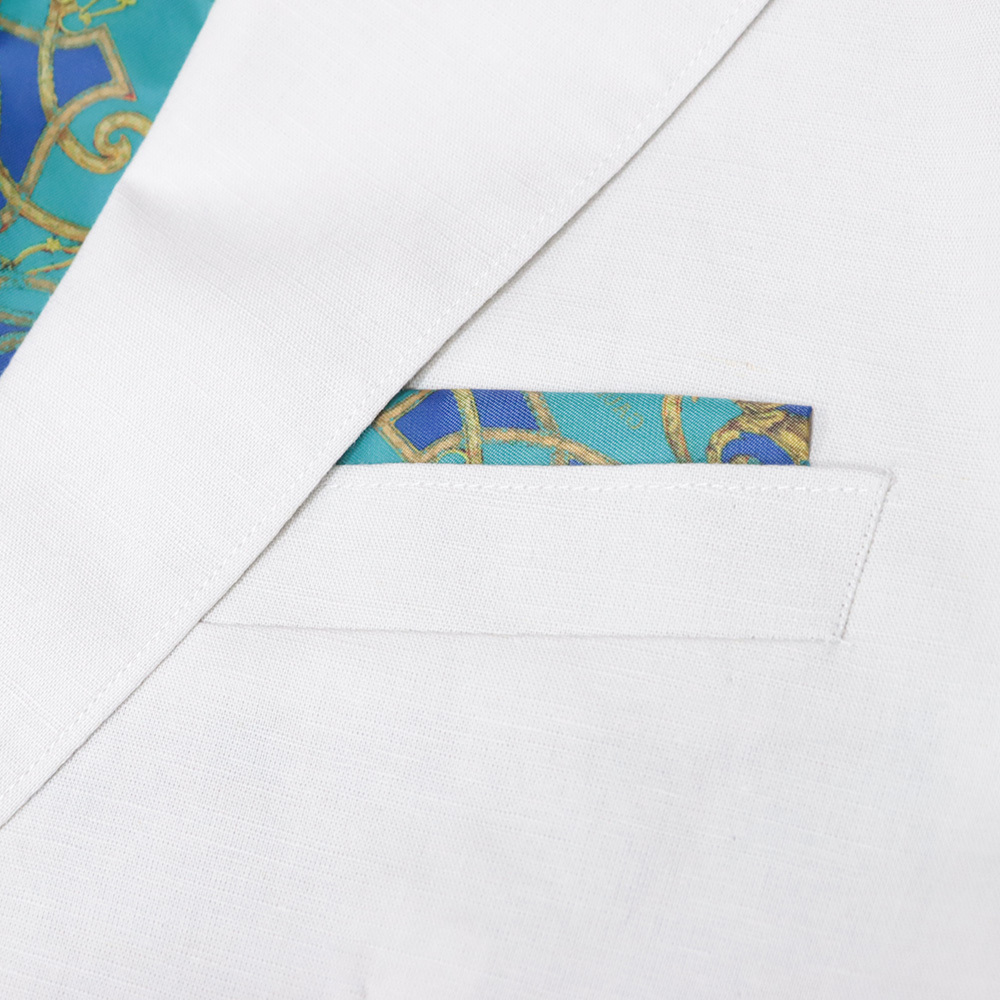 ジャケット:肩パッド、2ボタン、フェイクチーフ、センターベント、総裏地
