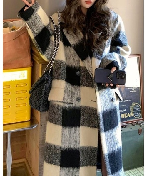 参考商品名:ブロックチェック中綿キルティングダブルロングコート