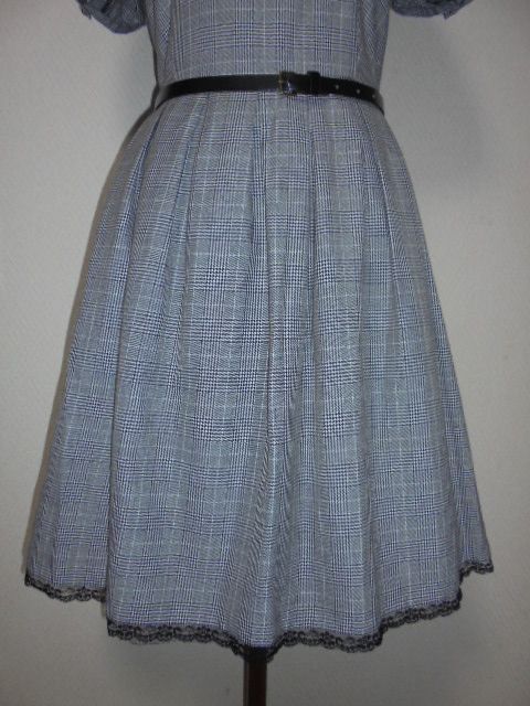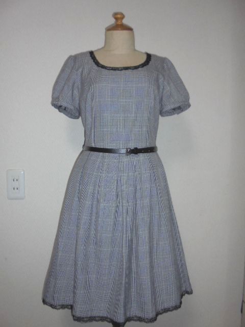 グランチェック柄襟ぐり裾レースW切替ベルト付タックプリーツOP
