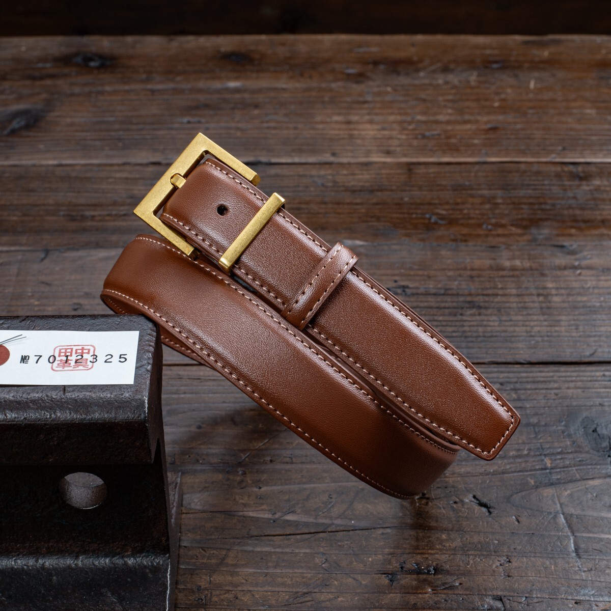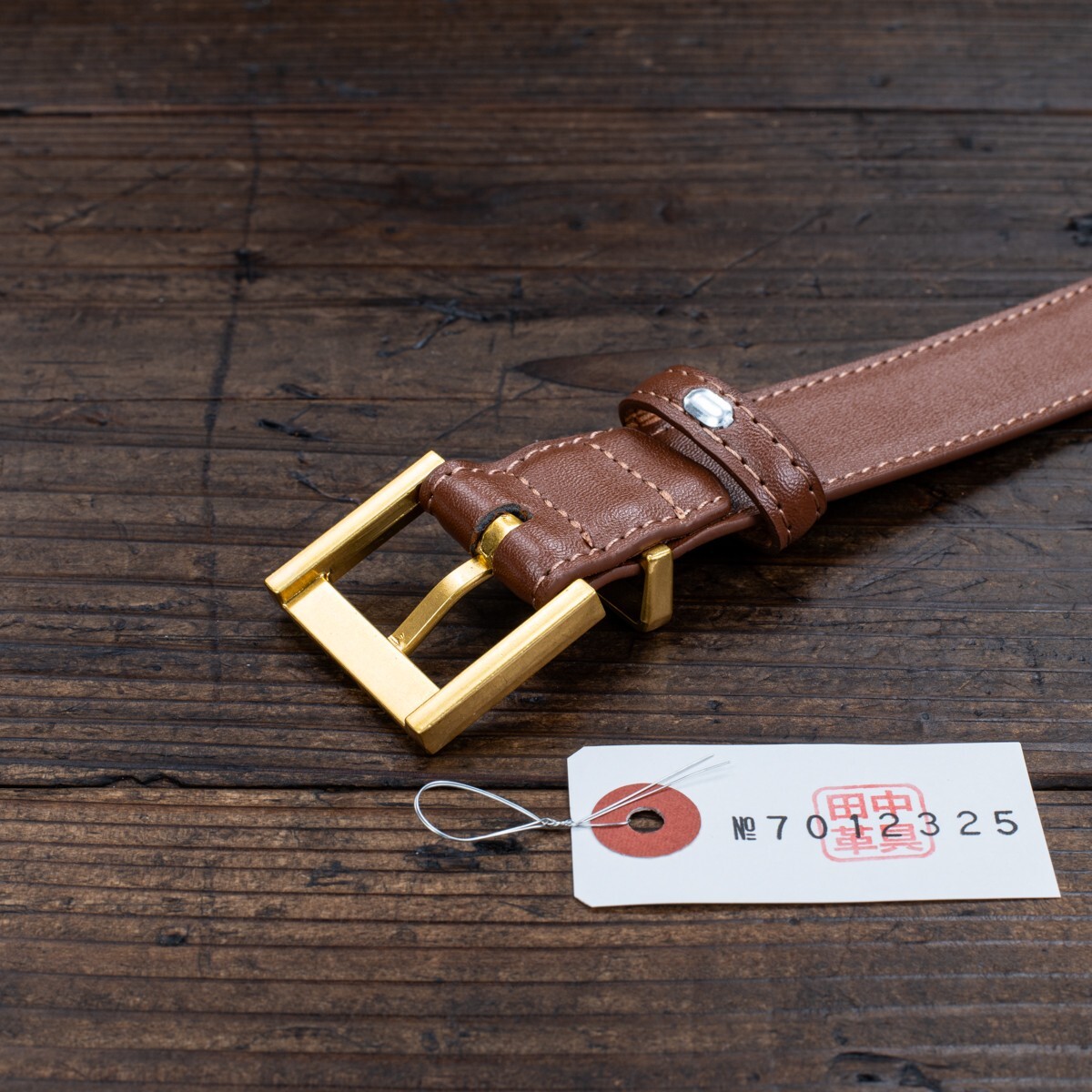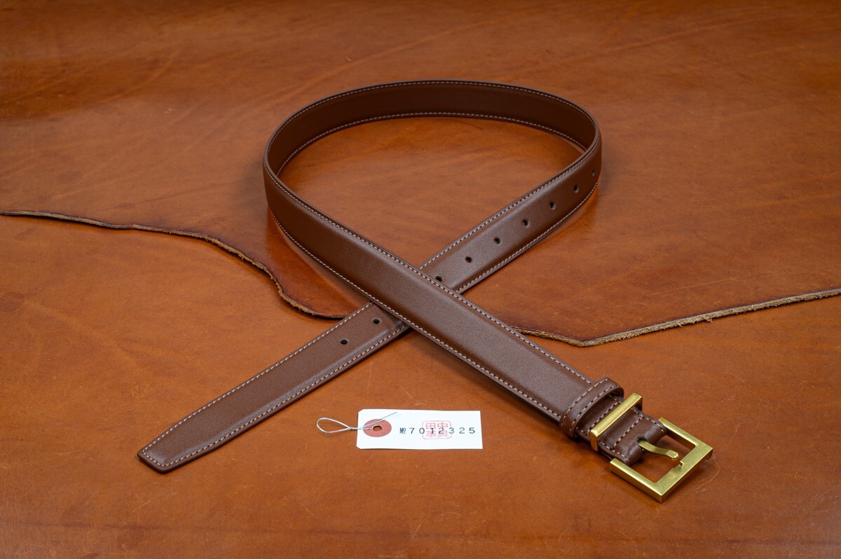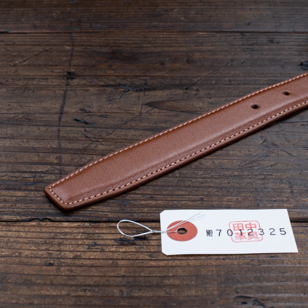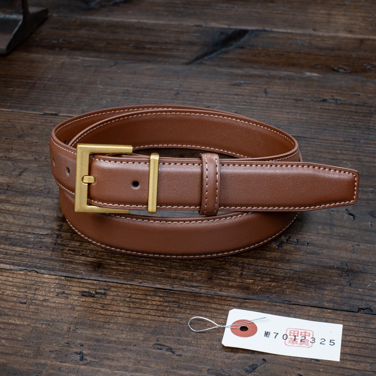 イタリアンレザーを使った細身のベルトです。革は両端をステッチでしっかりと留め、立体感を出しています。滑らかな表面に自然な光沢があり、ブラウンの落ち着いた色味が高級感を引き立てています。腰に巻いたときにはしなやかさが感じられ、柔らかな着け心地です。