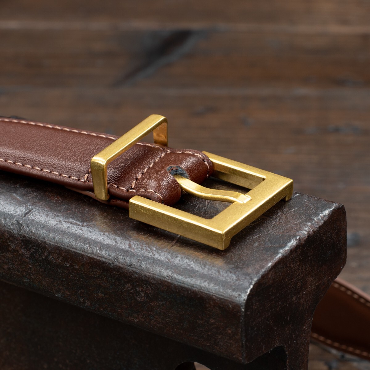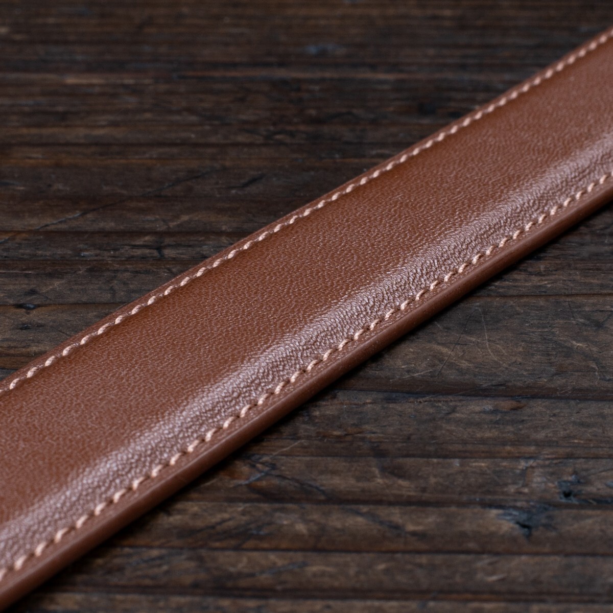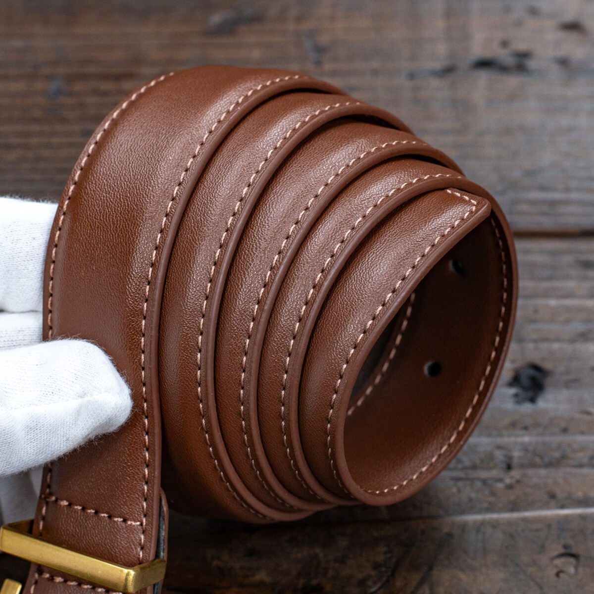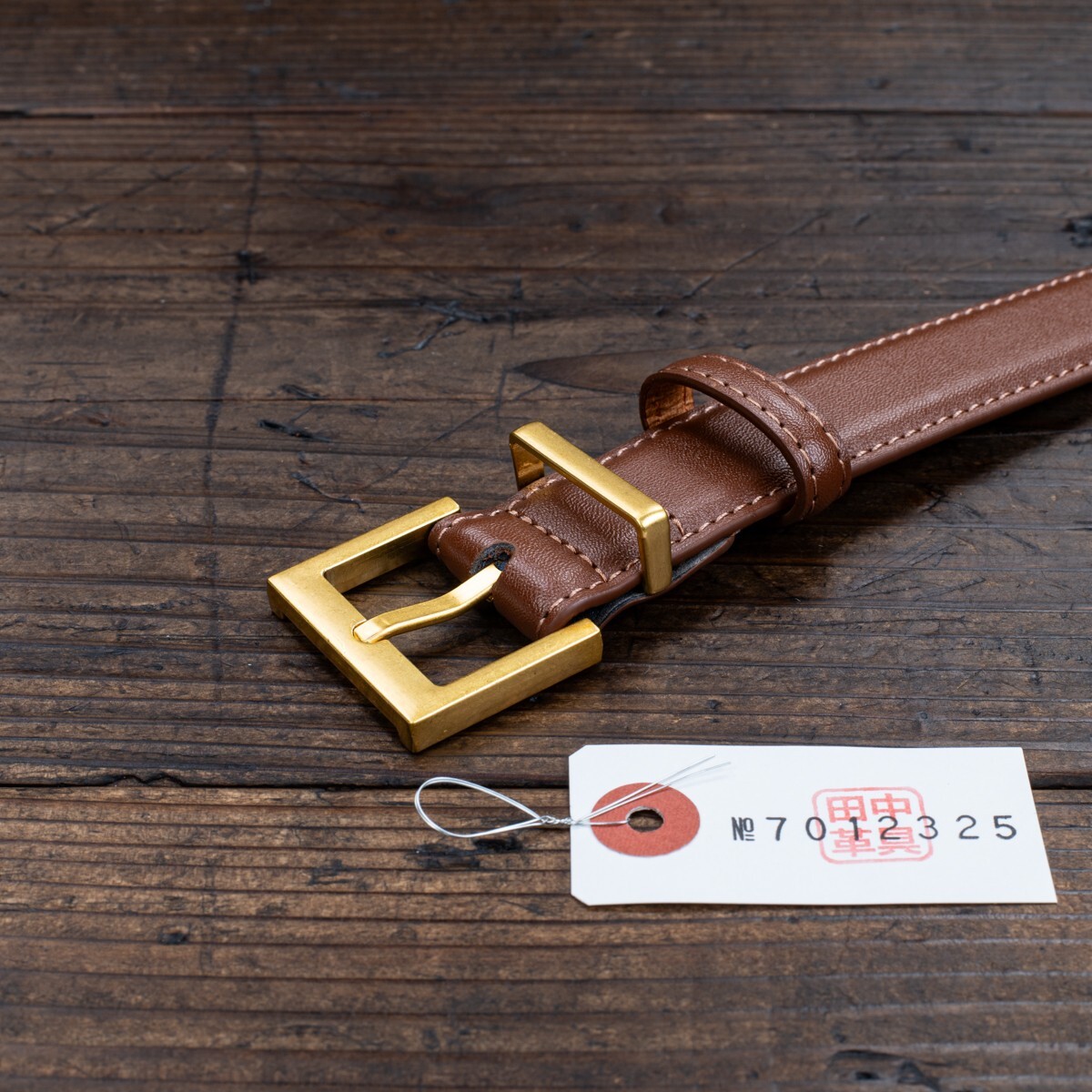 イタリアンレザーを使った細身のベルトです。革は両端をステッチでしっかりと留め、立体感を出しています。滑らかな表面に自然な光沢があり、ブラウンの落ち着いた色味が高級感を引き立てています。腰に巻いたときにはしなやかさが感じられ、柔らかな着け心地です。