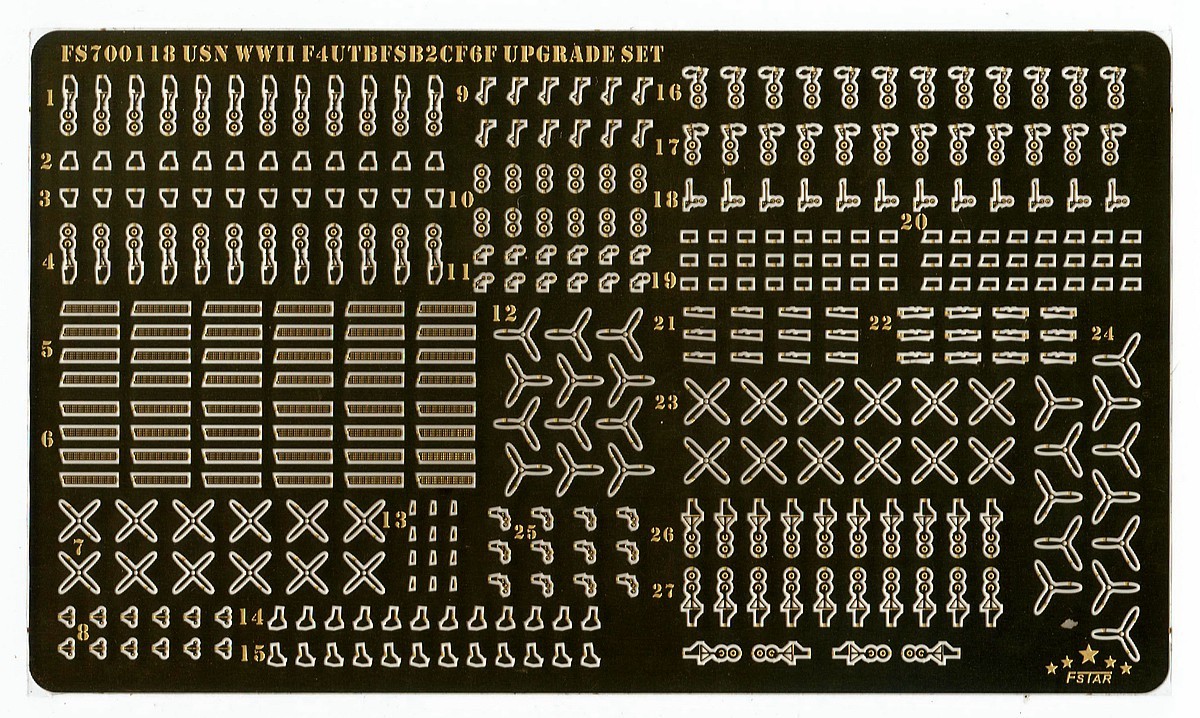 艦艇用金属製エッチングパーツ、細部を精密再現しました SB2C x12機、F6F x12機、F4U x12機、TBF x12機 金属製エッチングパーツ x1枚 |