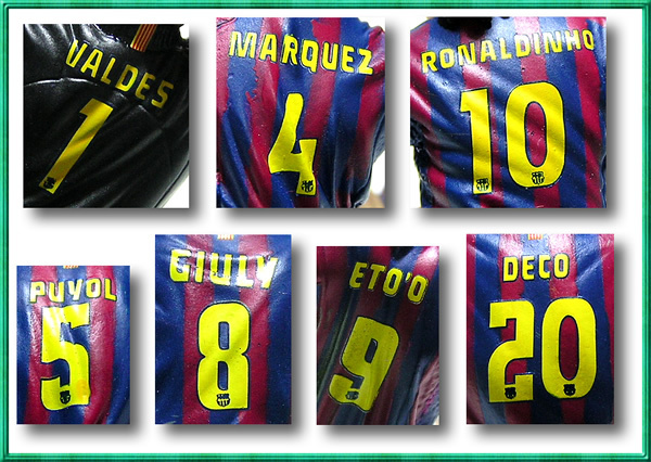 種類 | 定価790円(税込) ホーム・ユニフォーム全7種+アウェイ・ユニフォーム全7種 ●マルケス ●バルデス ●エトー ●ロナウジーニョ ●プジョル ●デコ ●ジュリ ※全高約8.2~10.1cm(台座含む) ※2006年6月発売 |