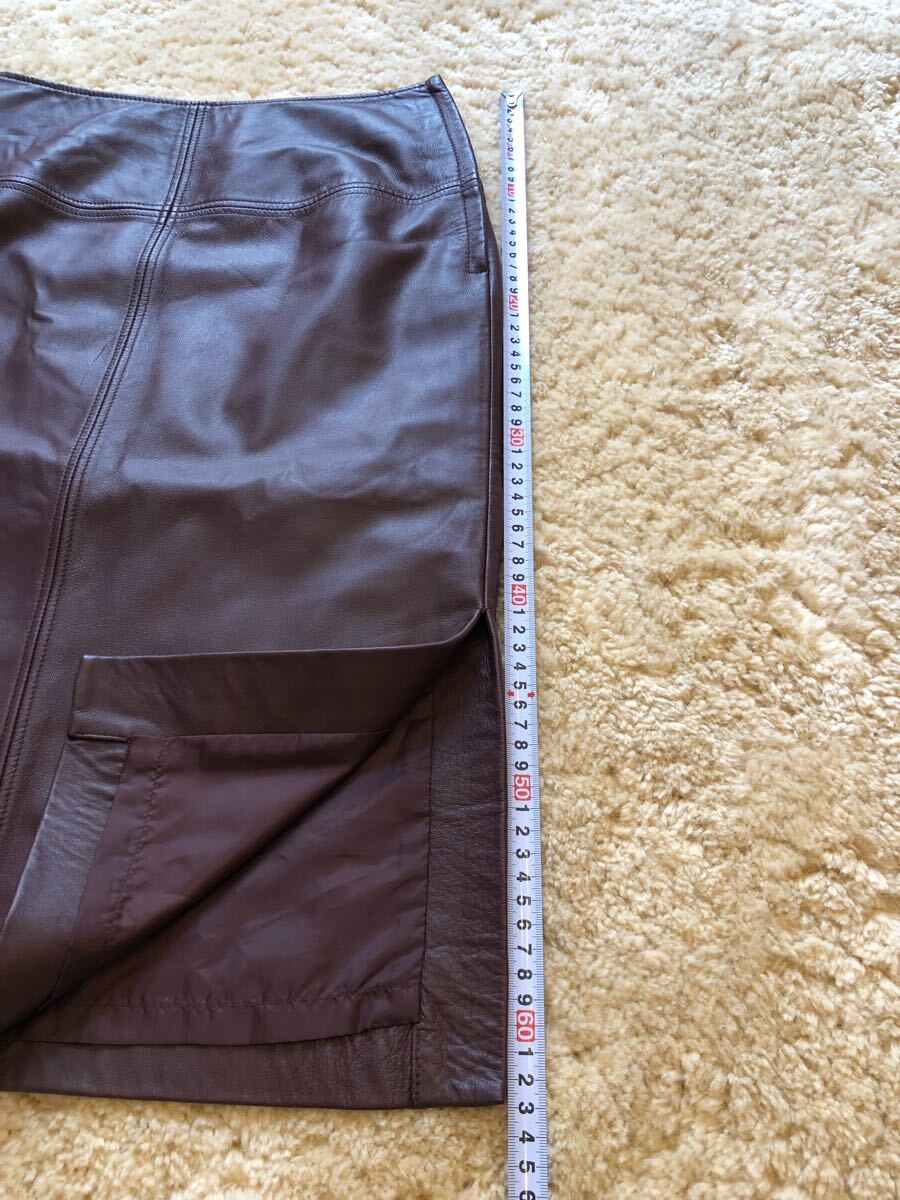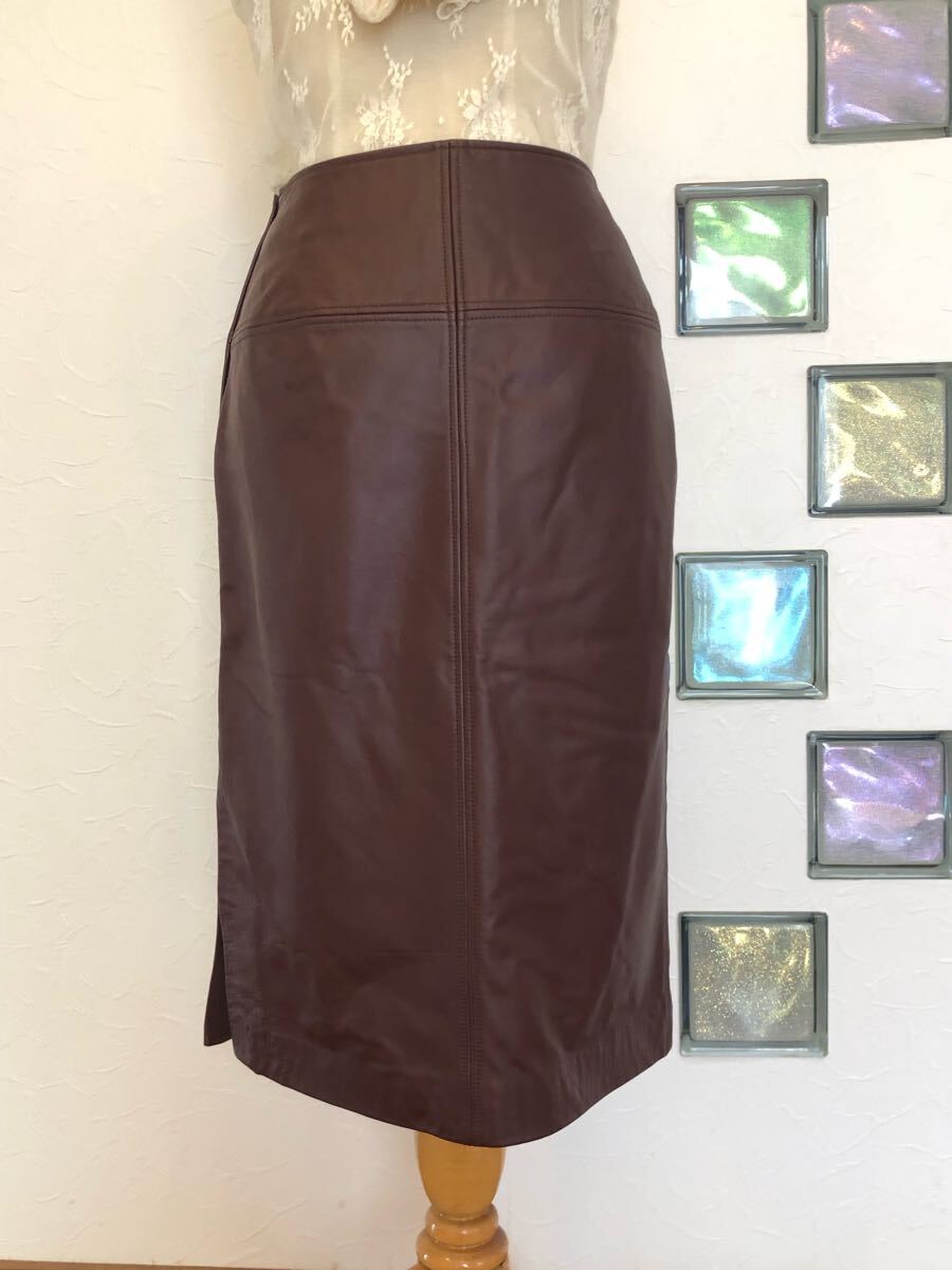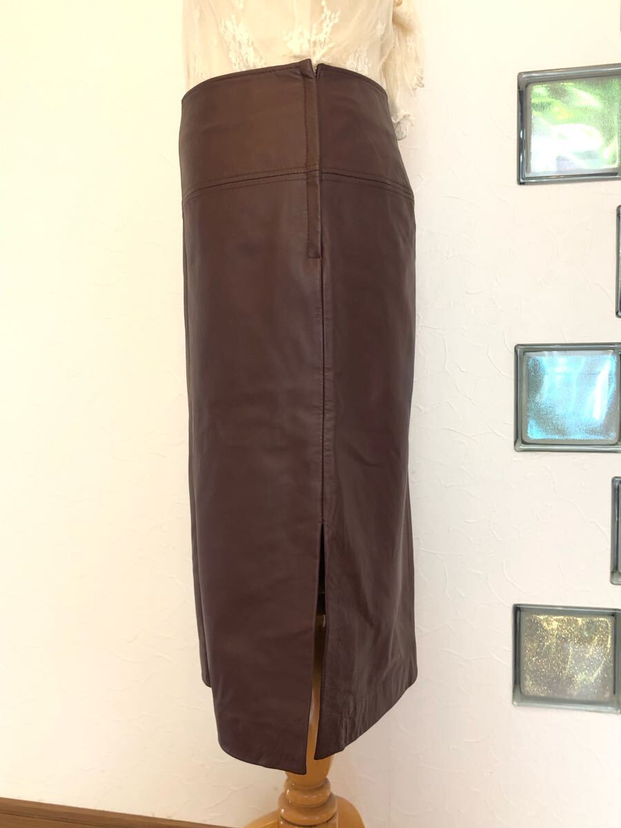 送料無料 美品 COMME CA コムサ 牛革本革 スムース リアルレザースカート 片側 サイドスリット ブラウン茶色 ストレートミモレ サイズ9