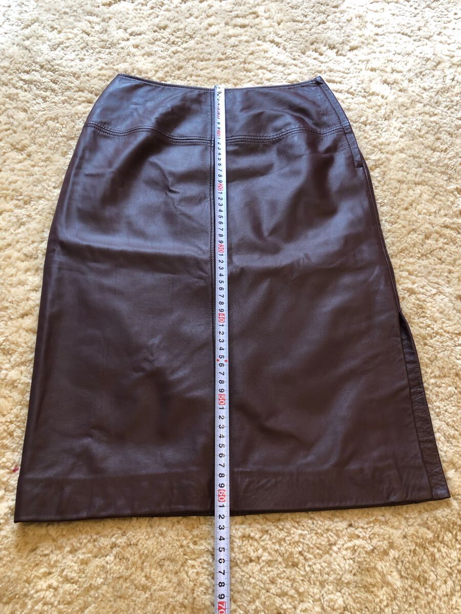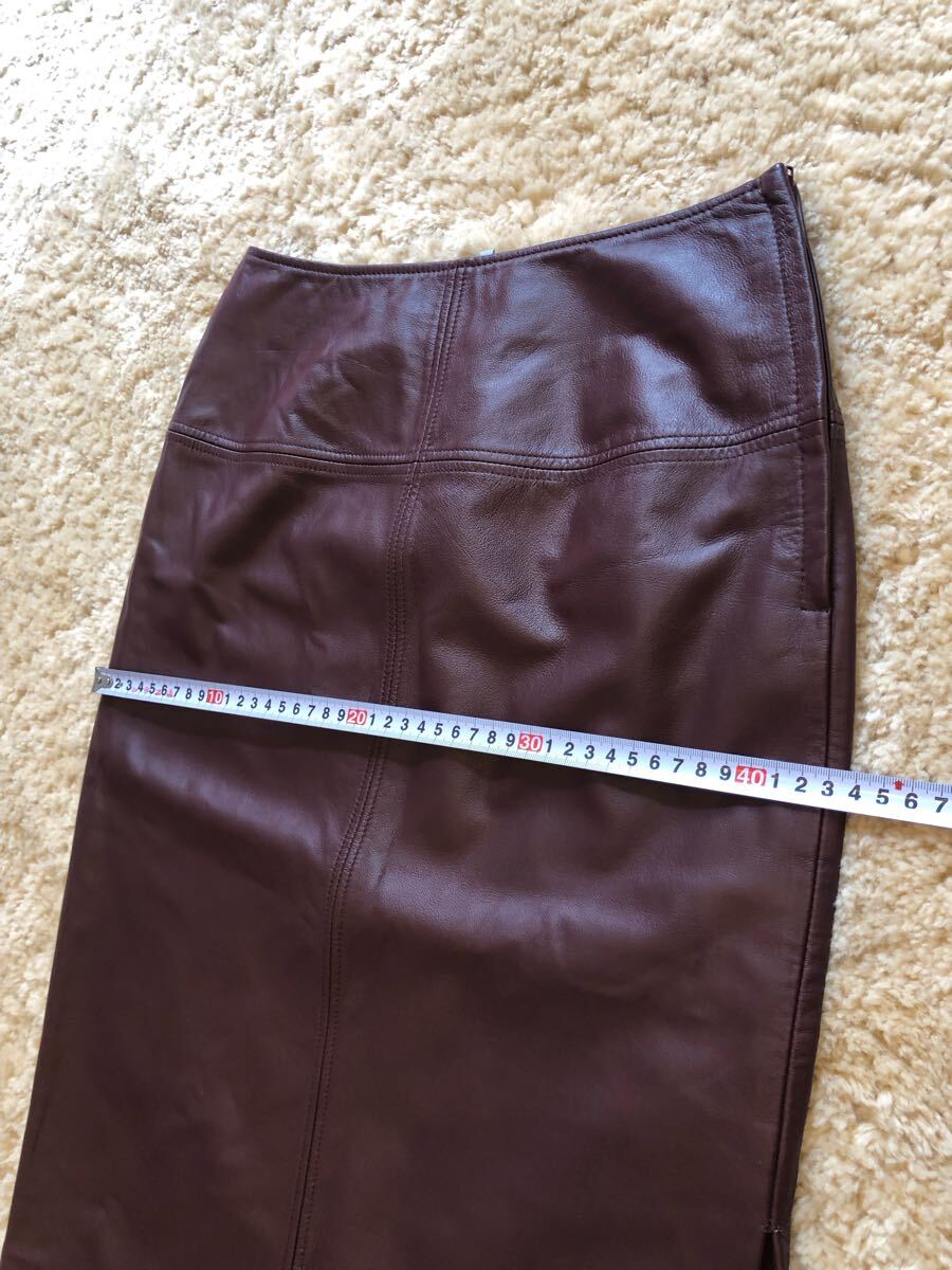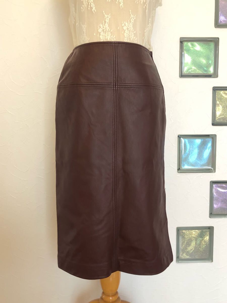 送料無料 美品 COMME CA コムサ 牛革本革 スムース リアルレザースカート 片側 サイドスリット ブラウン茶色 ストレートミモレ サイズ9