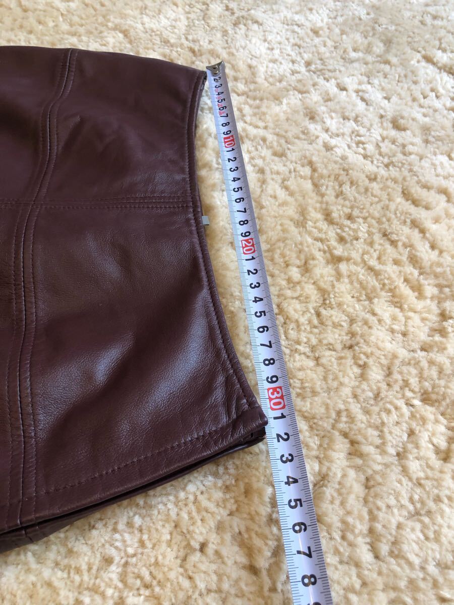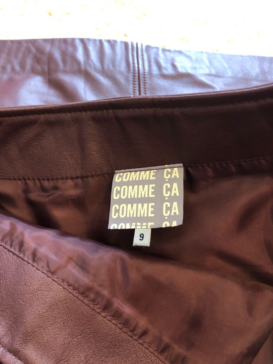 美品 COMME CA コムサ 牛革本革 スムース リアルレザースカート 片側左 サイドスリット ブラウン茶色 ストレートミモレ サイズ9
