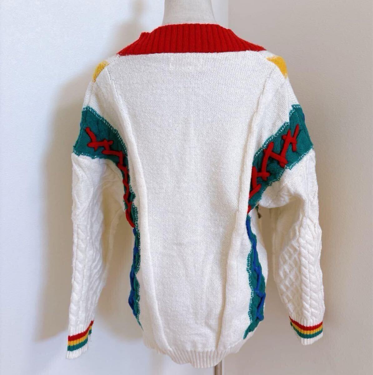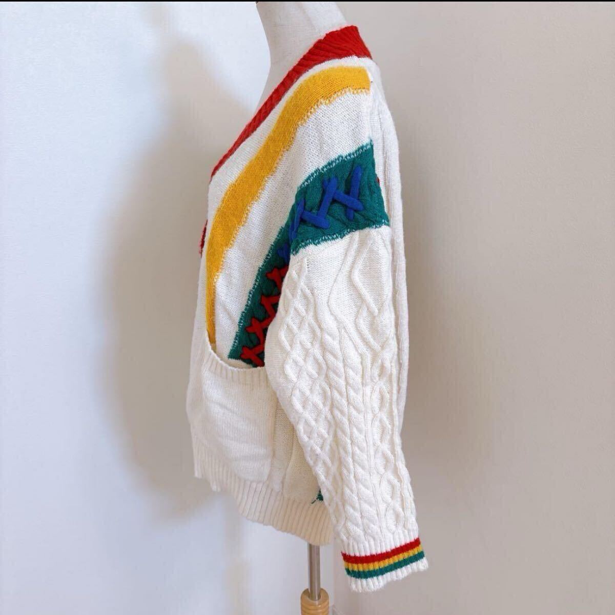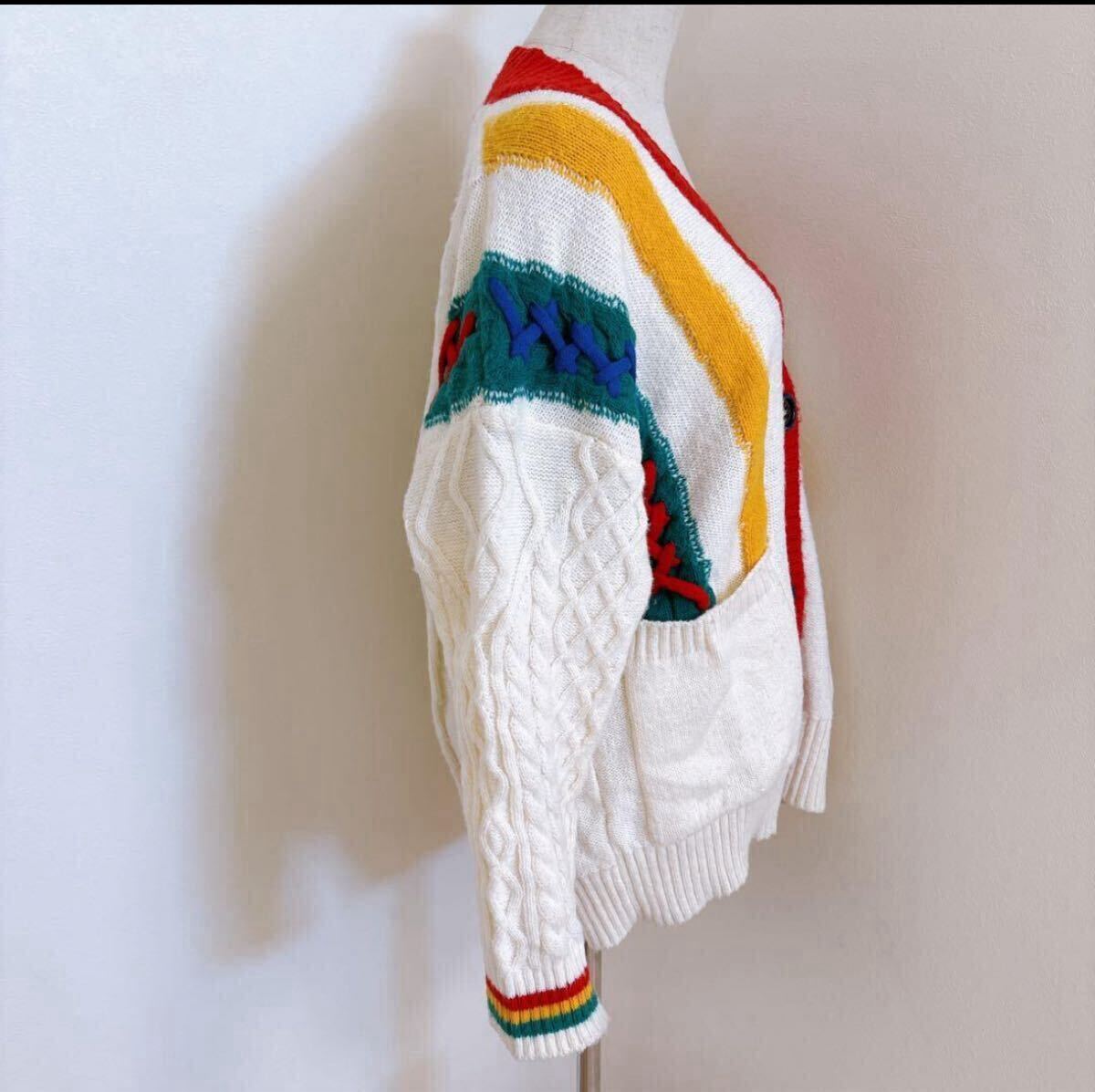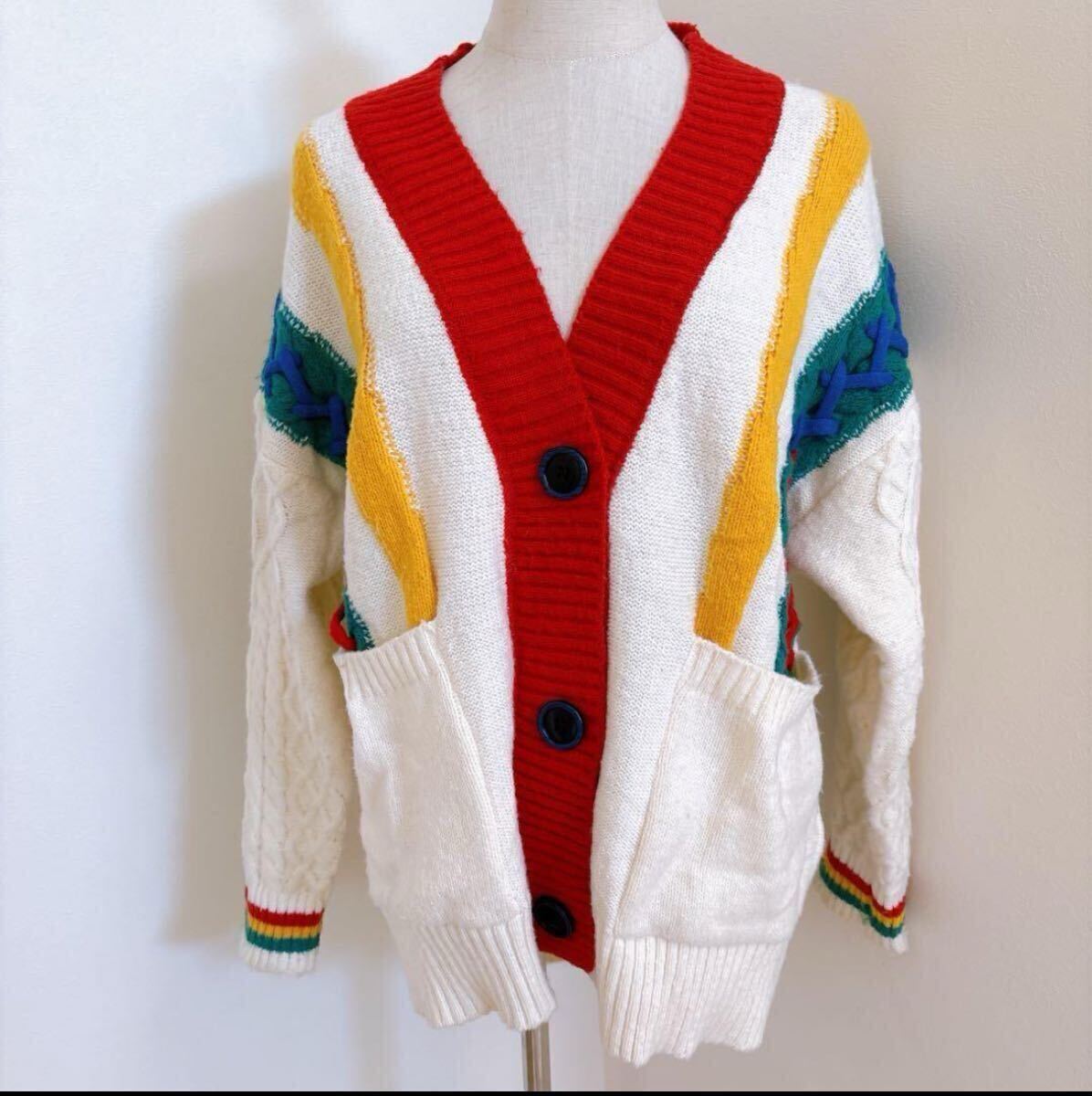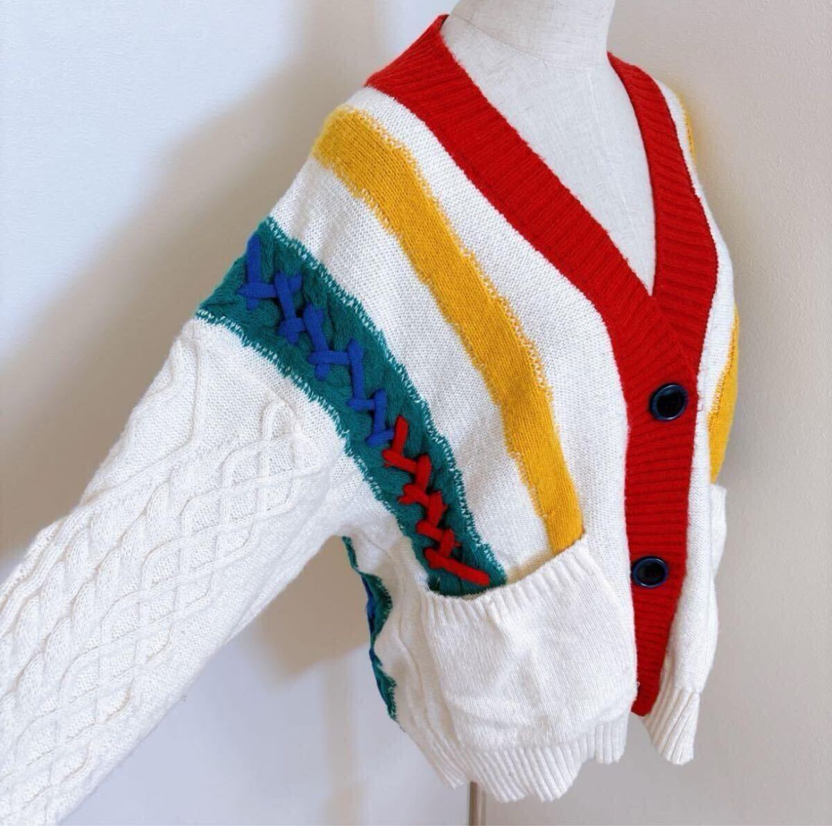 カラフルなマルチストライプが目を引く、レトロで個性的なケーブルニットカーディガンです。