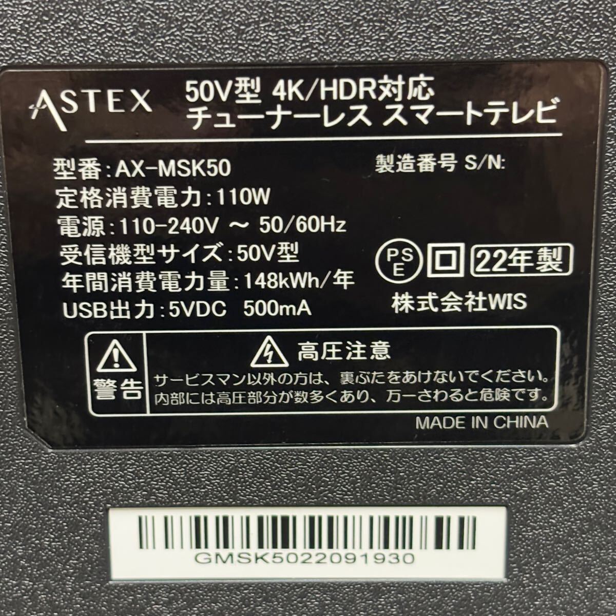 ○ASTEX AX-MSK50 50V型 4K 初期化済 本体 リモコン付 HDR対応 Android TV チューナーレス スマートテレビ 2022年製 直接引き取り大歓迎になります。