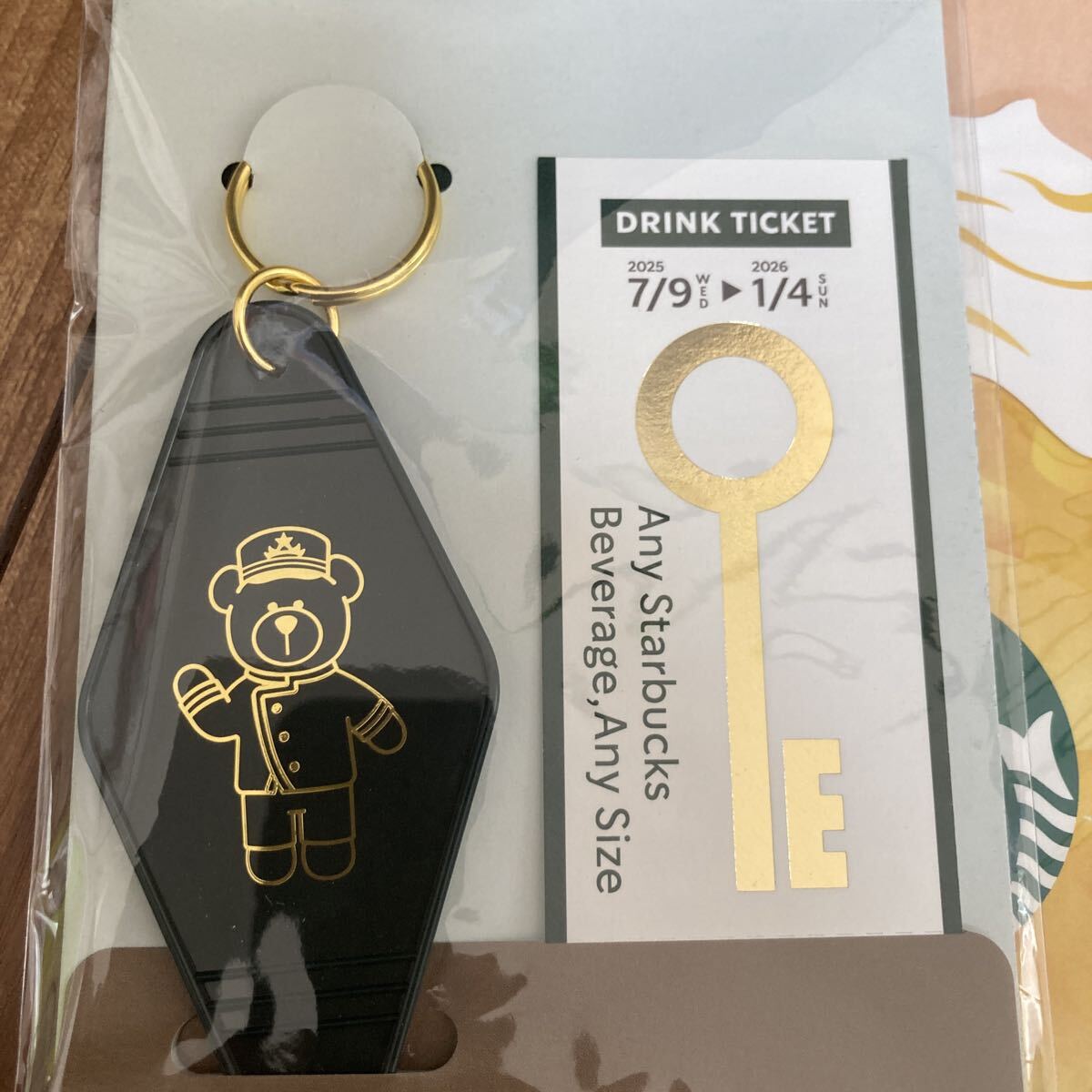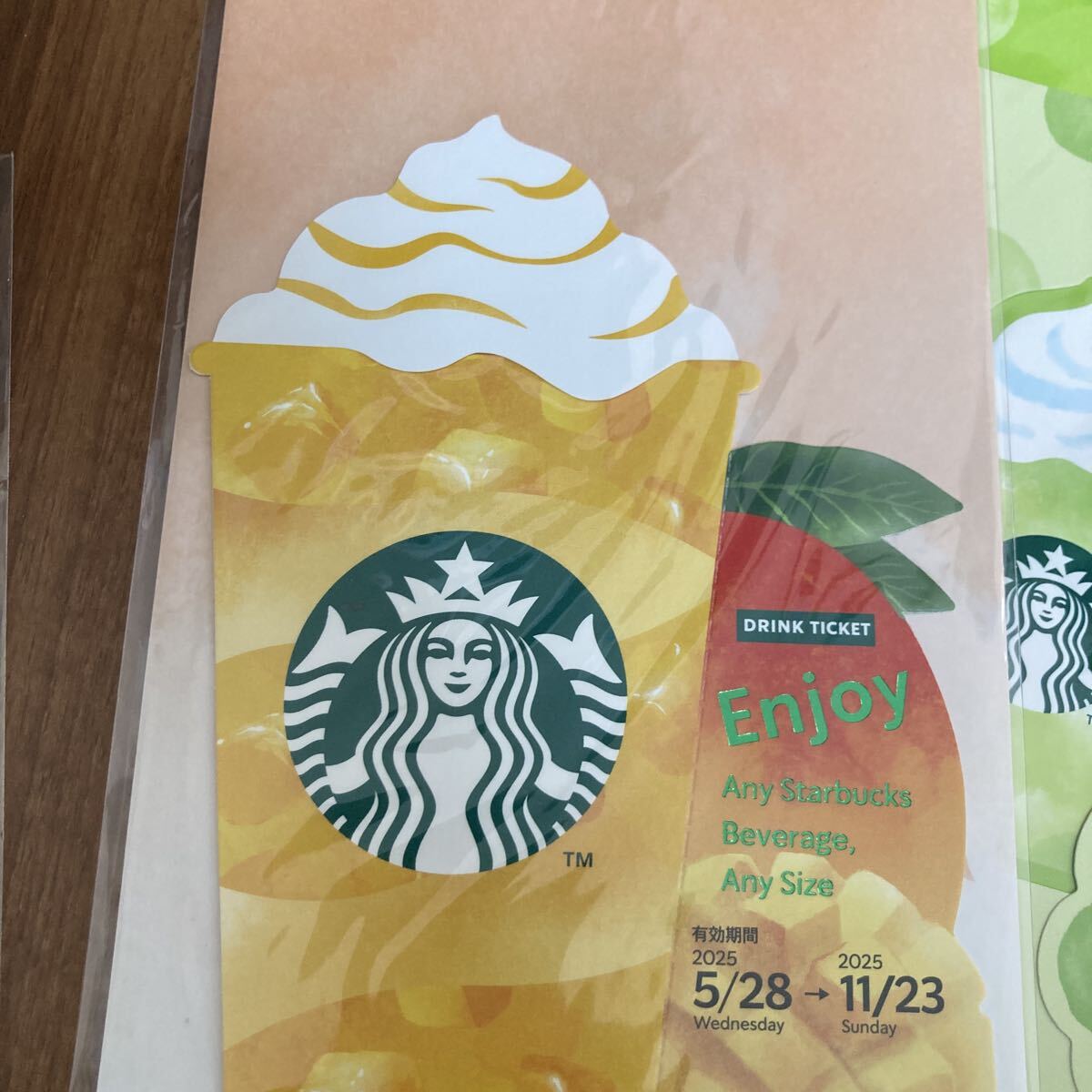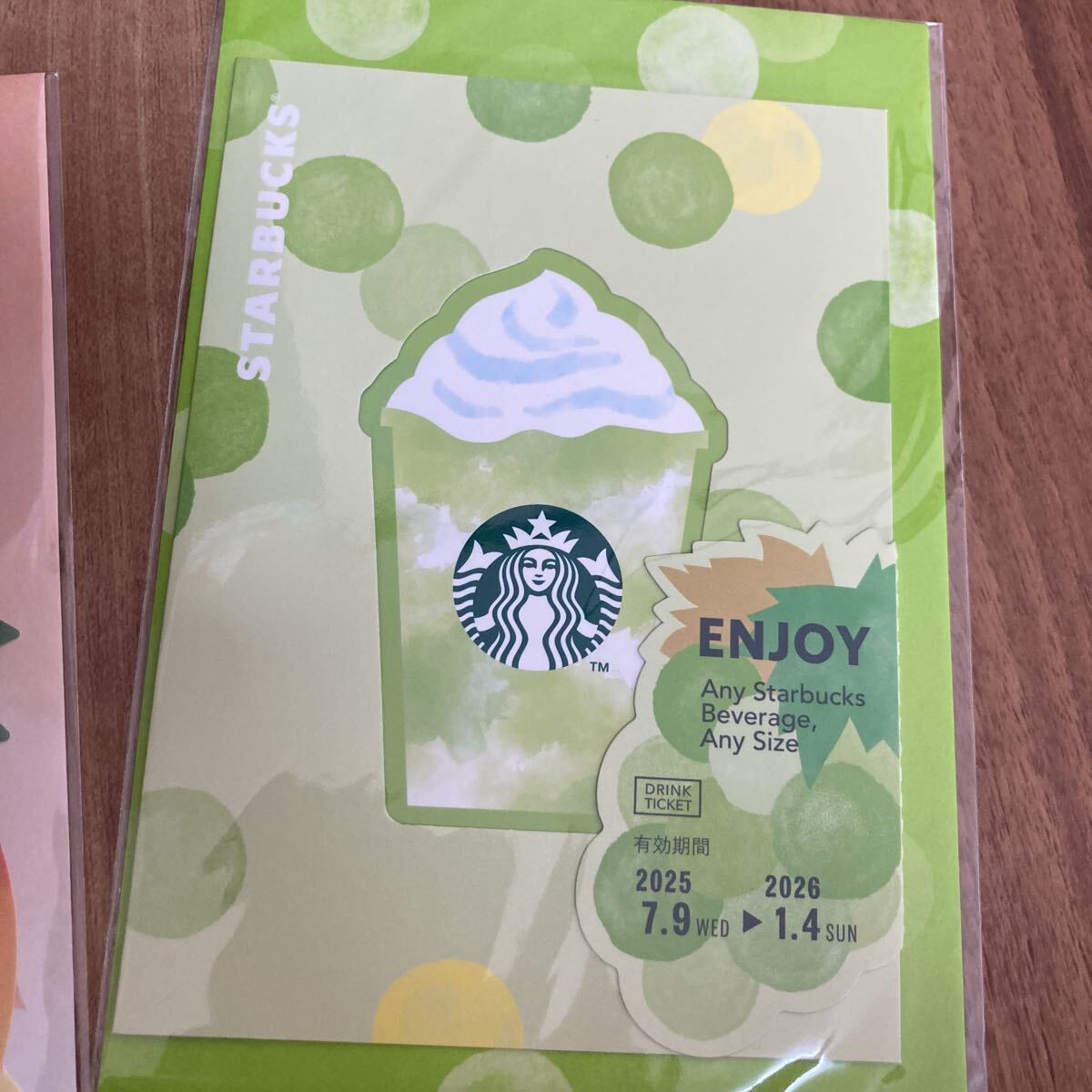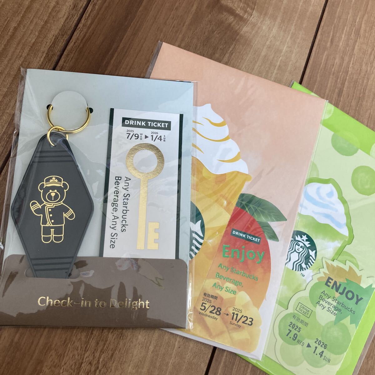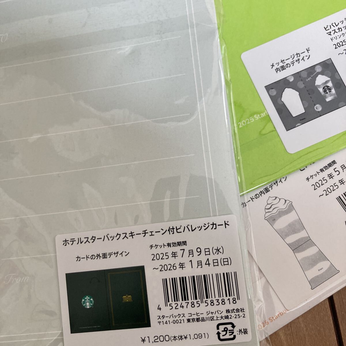 スターバックス のビバレッジカード、マンゴー フラペチーノ柄1枚 とマスカット柄1枚 とスタバホテルのキーホルダー付き1点のメッセージカードです。
