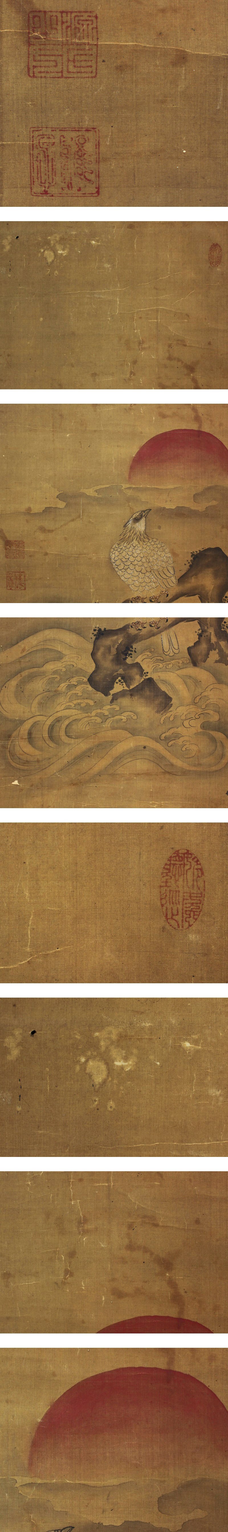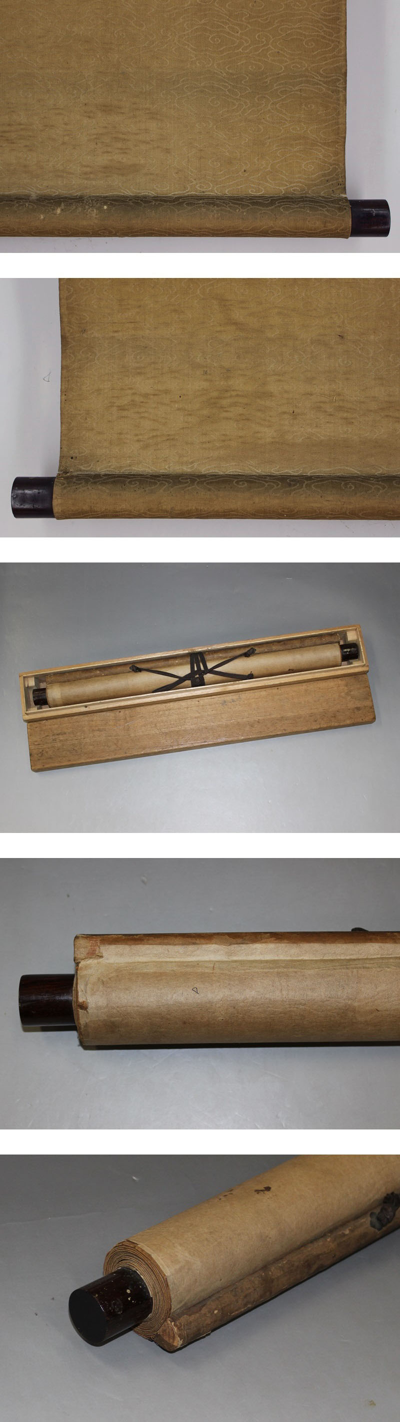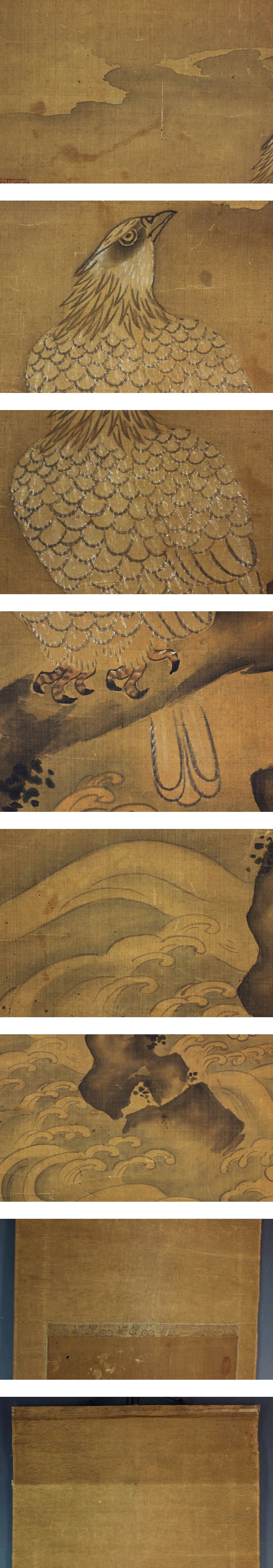 在印【古画・鷹に日の出】 本紙は、染み、汚れ、強い折れ、皺、擦れ、破れ、生地剝れ、 虫食い、強いヤケがあります。 表装は、染み、汚れ、折れ、皺、くすみ、虫食い、破れ、ほつれがあり、 軸先に汚れがあります。 【サイズ】 作品 横約37.5cm×縦約86.5cm 表装 横約48cm×縦約160.5cm |
