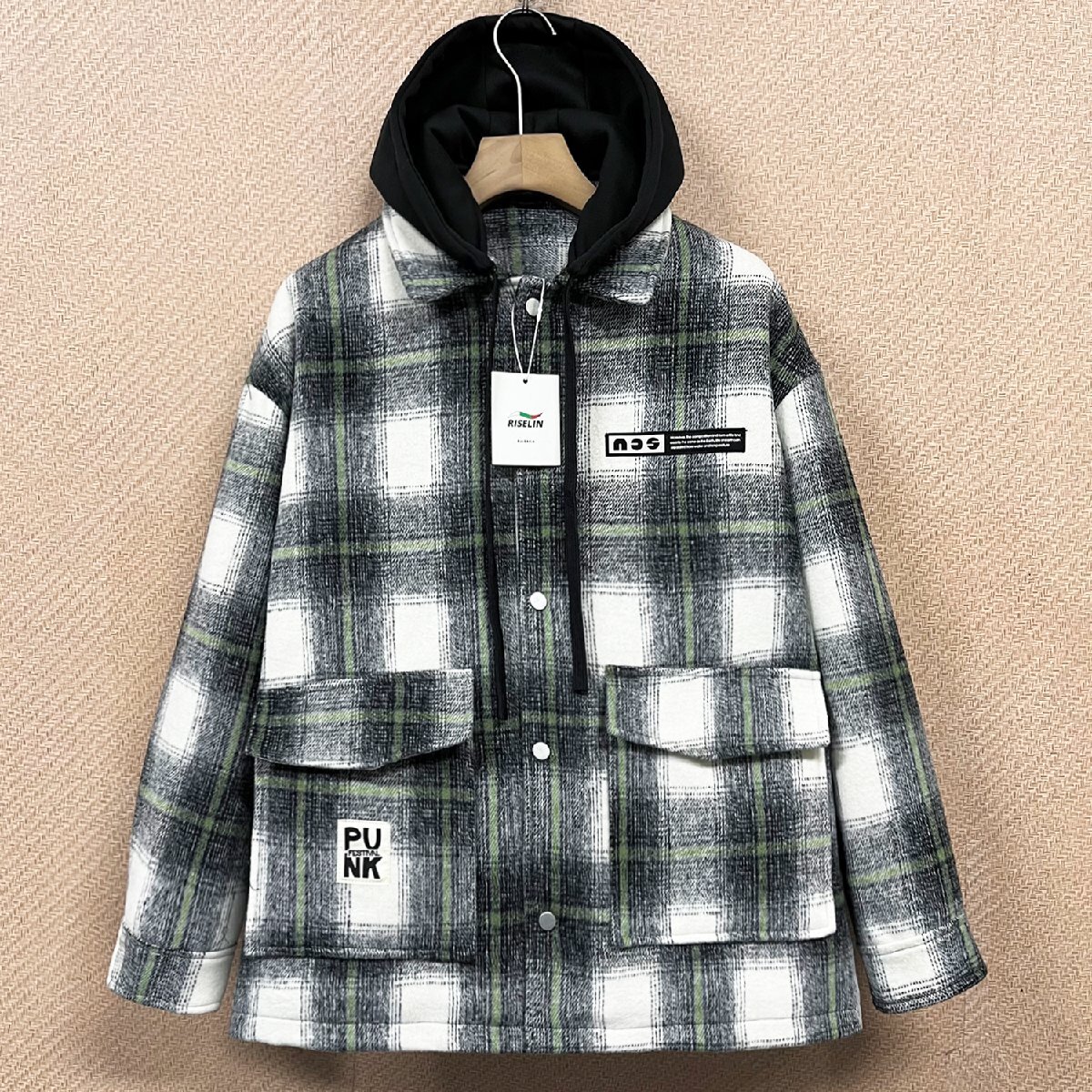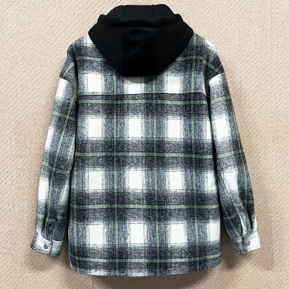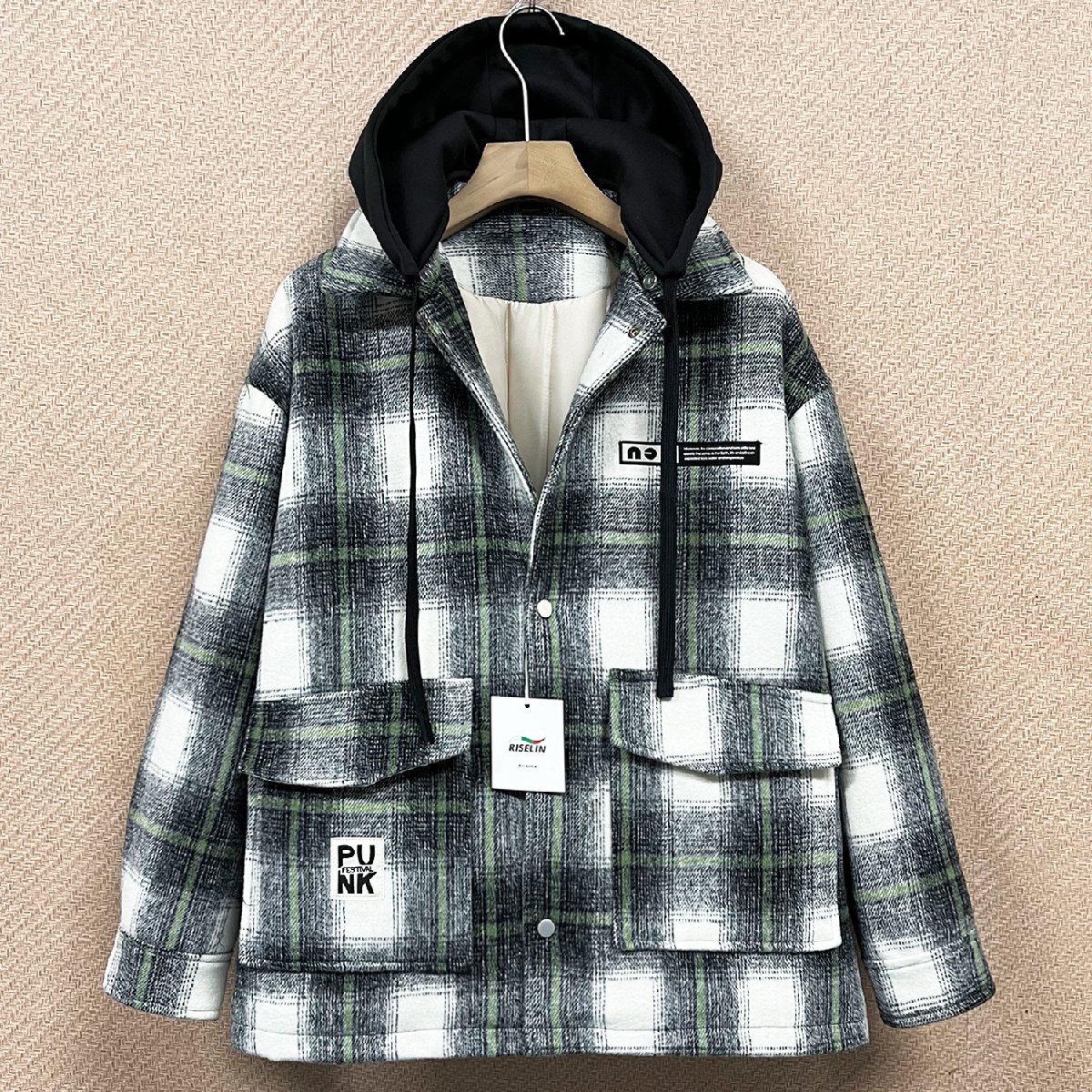 スタイリッシュで汎用性の高いチェック柄に上品な風合いを落とし込んだジャケットです。フード取り外し可能のデザイン、フードの仕様と折り襟の仕様を両方楽しめます。フードが付いているとき、ある程度に風を防ぎ、保温性高くなります。フード取り外しのとき、大人のカジュアルスタイル演出することができます。三つのポケット(サイトポケット*2/裏ポケット*1)が付いています。基本的な小物を収納できるし、収納力が高い!寒い日に冷たい手をサイドポケットに入れて温めることができます。