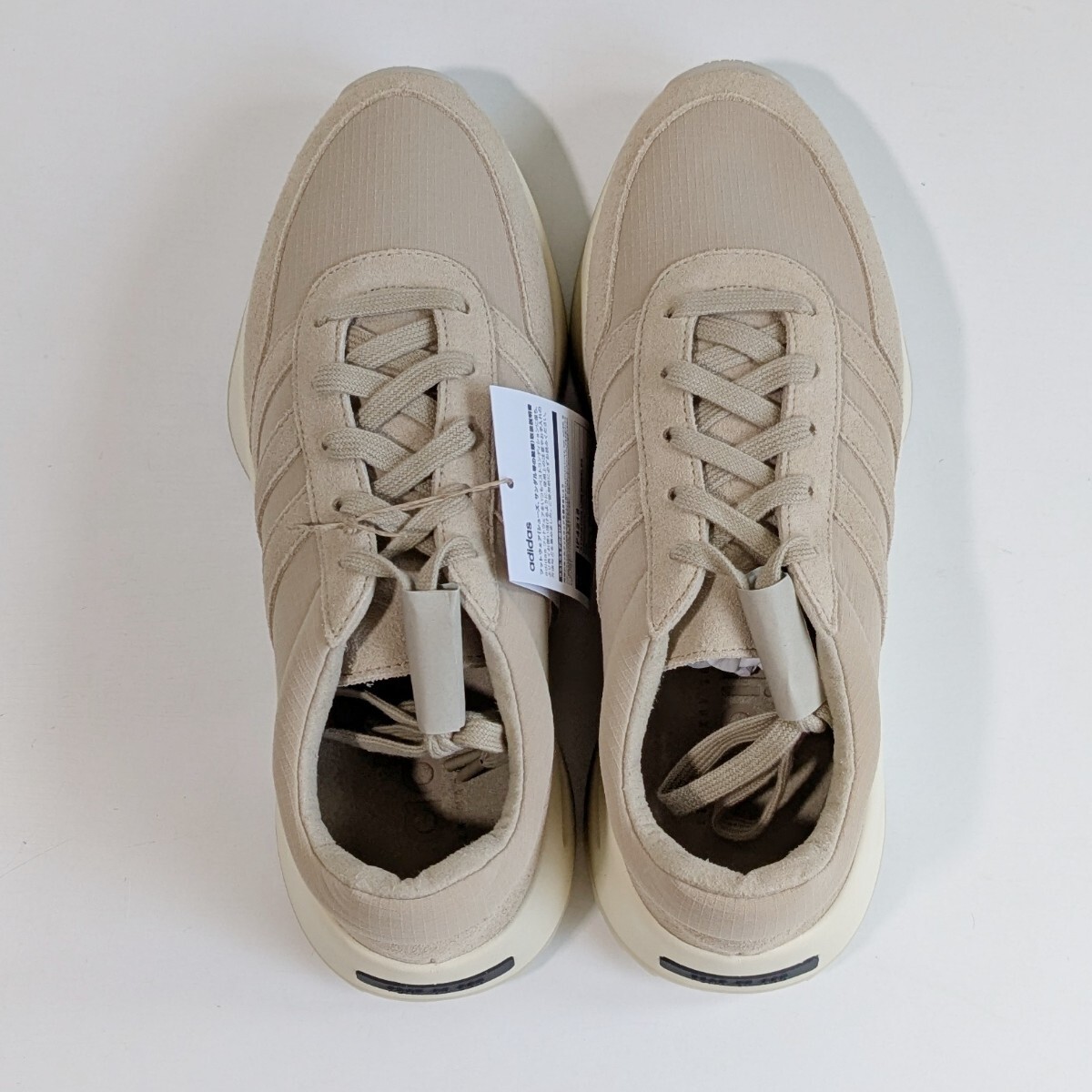 アイコニックなLA トレーナーを、Fear of God Athleticsが再構築。高品質なスエードと丈夫なリップストップファブリック、ウェイビーなラバーアウトソールを組み合わせた シューズ。パッド入りシュータン、快適な履き心地をもたらすEVAミッドソール、フィット感を調節しやすいトグル付きシューレースなど、特徴的な要素も満載。クォーターパネルにはスリーストライプス、ソールには adidasロゴをエンボス加工、さらにかかとのブラックバーにFear of Godロゴをエンボス加工するなど、随所にブランディングを施している。