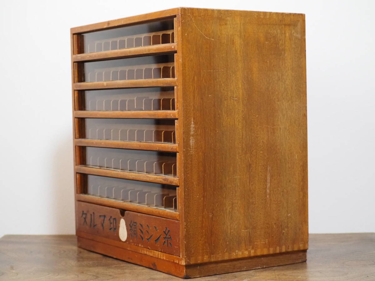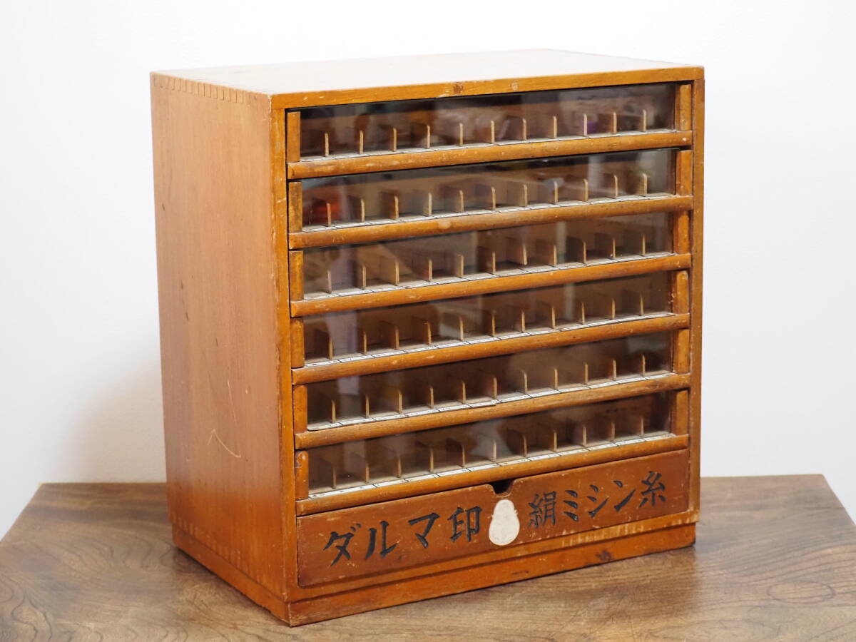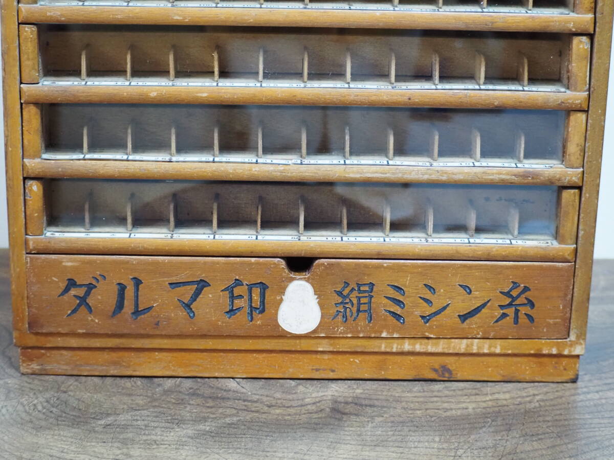 昭和レトロ【ダルマ印 絹ミシン糸】7段 ガラス入小引き出し ミシン糸ケース 陳列ケース◆非売品 アンティーク 木製陳列棚 収納棚 店舗什器