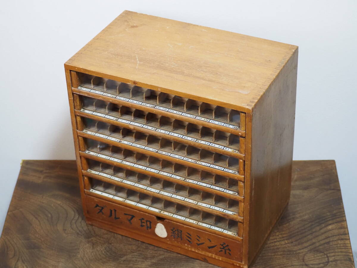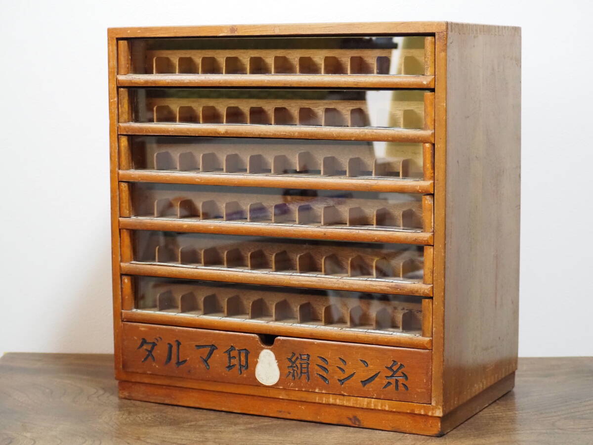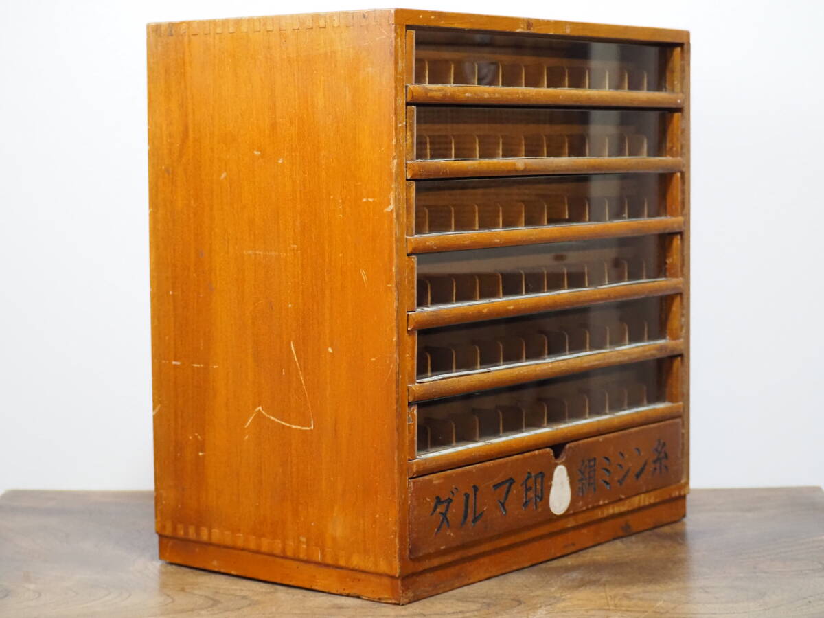 昭和レトロ【ダルマ印 絹ミシン糸】7段 ガラス入小引き出し ミシン糸ケース 陳列ケース◆非売品 アンティーク 木製陳列棚 収納棚 店舗什器