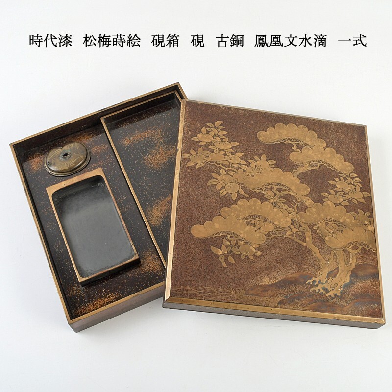 書道具 時代漆 松梅蒔絵 硯箱 硯 古銅 鳳凰文水滴 一式 DHWP