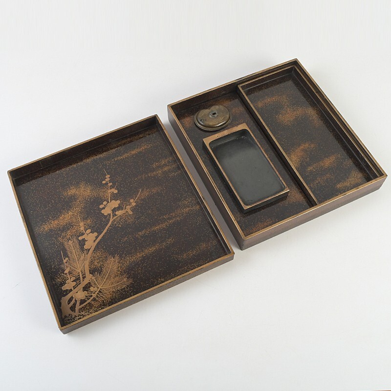 【書道具 時代漆 松梅蒔絵 硯箱 硯 古銅 鳳凰文水滴 一式 DHWP】