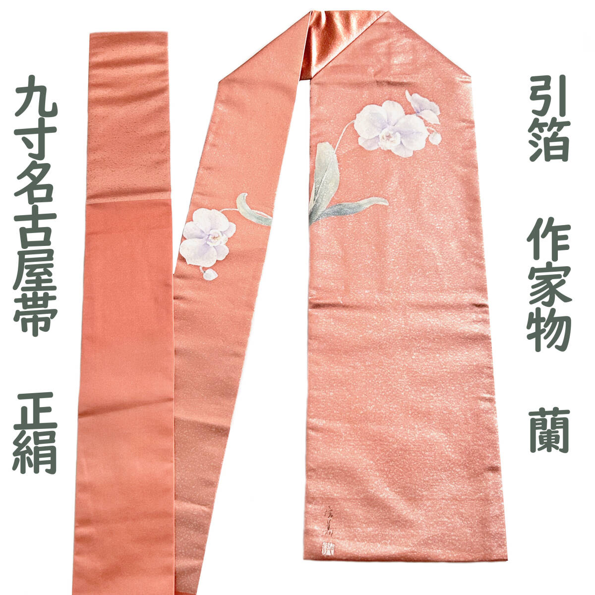 ★九寸名古屋帯 正絹 引箔 作家物 蘭 手書き お太鼓柄 西陣織 オレンジベージュ カジュアル 仕立て上がり 送料無料★