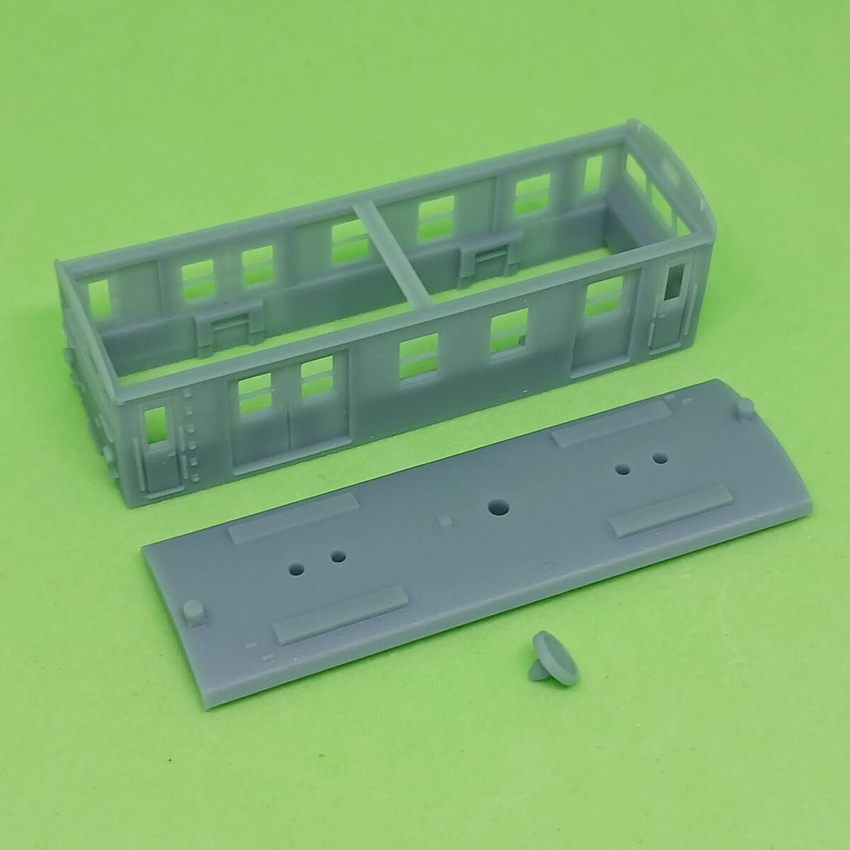 台車、パンタグラフは付属しませんので別途ご用意下さい。台車はkatoチビ客車用動力ユニットが使用出来ます(動力ユニットの両端の手すりは切り落として下さい)。パンタグラフは、kato等の取り付け穴が車両の前後方向に2つ付いているタイプが使用可能です。