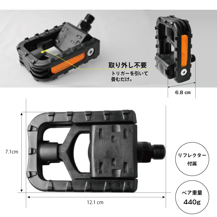 優れた耐久性のあるガラス繊維強化ナイロン製フラットペダル。 ペダルを取り外さずにワンタッチで約半分程に収まります。 ・折り畳み機能は走行中に機能する事は無く 中央トリガーを引く事でペダルの収納ができます。 ・フラット面の凹凸形状により、滑らず靴底を捕らえます。 ・輪行時や車載の際の横の張りを抑え、格段に収納しやすくなります ・前後反射板リフレクターにより夜間の走行でも安心。 ・街乗り等の普段使いから、輪行、サイクリングに ロードバイク、マウンテンバイク、ミニベロ、クロスバイク、ママチャリなどの自転車ペダル切り替えにオススメです。 内容 サイズ:使用時:横幅7.1x長さ12.1x厚み3.1 cm 収納時:横幅7.1x長さ6.8x厚み9.7 cm 重量:440g(ペア) 材質:ガラス繊維強化ナイロン、カーボン、スチール カラー:ブラック 取り付け:ペダルレンチ9/16 特徴:折り畳み可能 反射板リフレクター ・ディスプレイ環境により実物と色が異なる場合が有ります。 ・入荷時期により予告無く一部仕様変更する場合が有ります。 ・表記サイズは商品の伸びの無い寸法計測数値です。 |