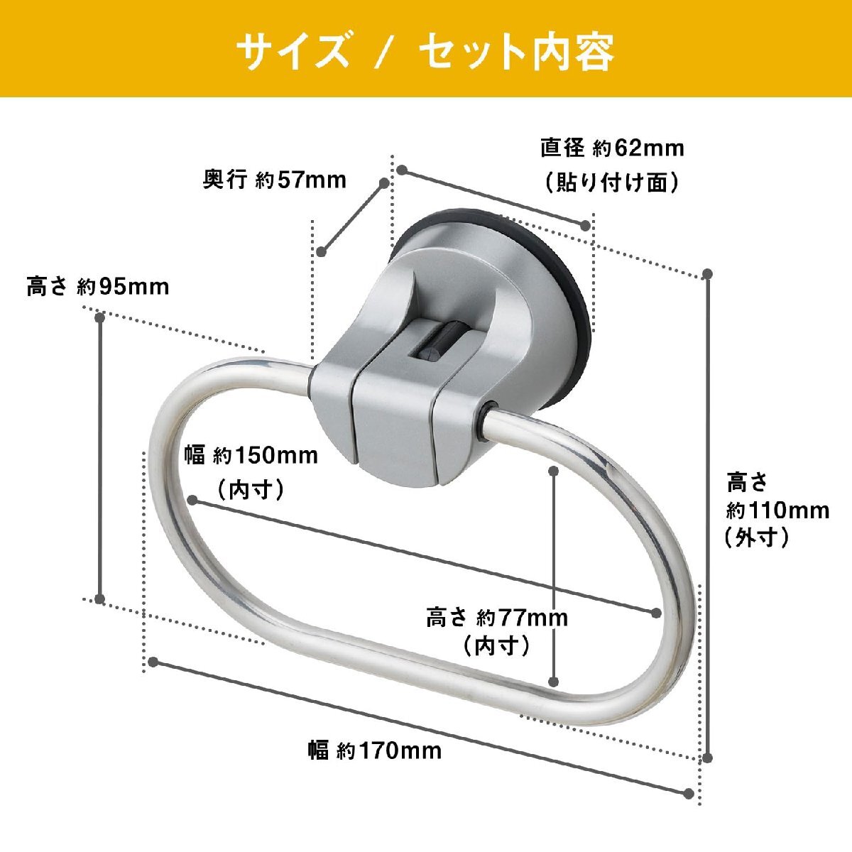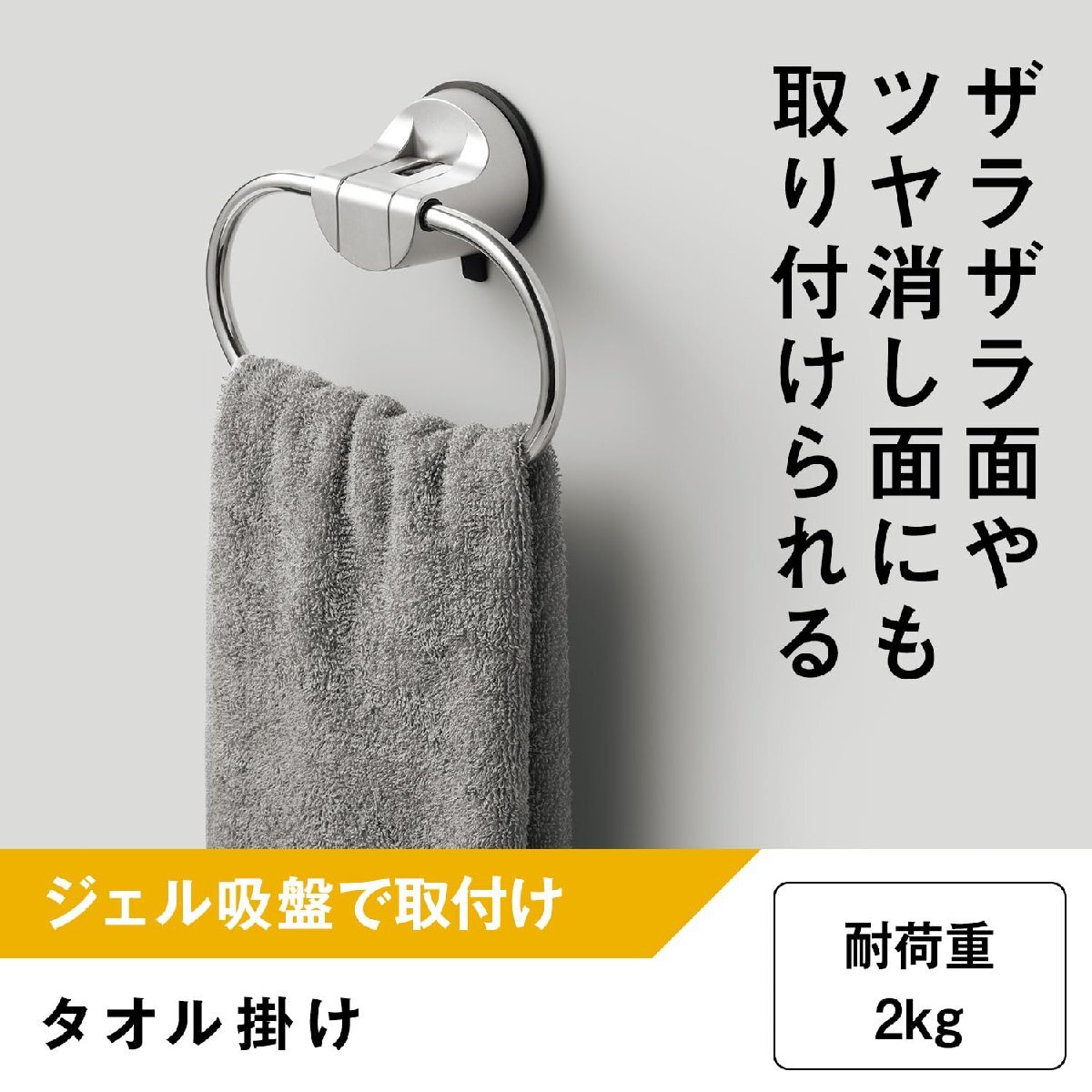 説明 ●ザラザラ面やツヤ消し面にも取り付けられます。 ●サビにくいステンレスリングです。 ●耐荷重2kg ●ジェル面が強力に吸着します。