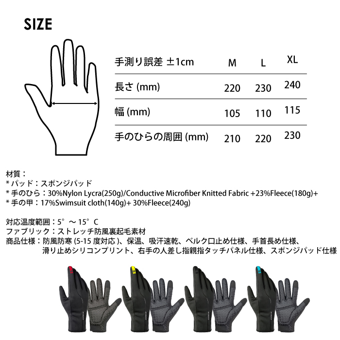 秋冬用グローブ 人指し指はタッチパネル対応なのでスマホやタブレット、サイクルコンピューターの操作も装着したまま行えます。 防水機能で急な雨でも水の侵入を遮ります。 雨や防風で体温を奪われたり、冷気によって手の温度を下げる事も軽減します。 グローブ内は裏起毛で保温 ・防水・防風・保温に優れています。 ・タッチパネル対応 ・静電気防止可能、洗浄可能、幅(約)5.5cmの手首 ・ベロクロ式でしっかり締めれます。 ・男女兼用 材質:ポリエステル、ライクラ 商品は入荷によりキズがある場合があります。 入荷時期により予告無く一部仕様変更する場合が有ります。 カラーはディスプレイ種類環境等により実物と異なって見える場合がございます。 |