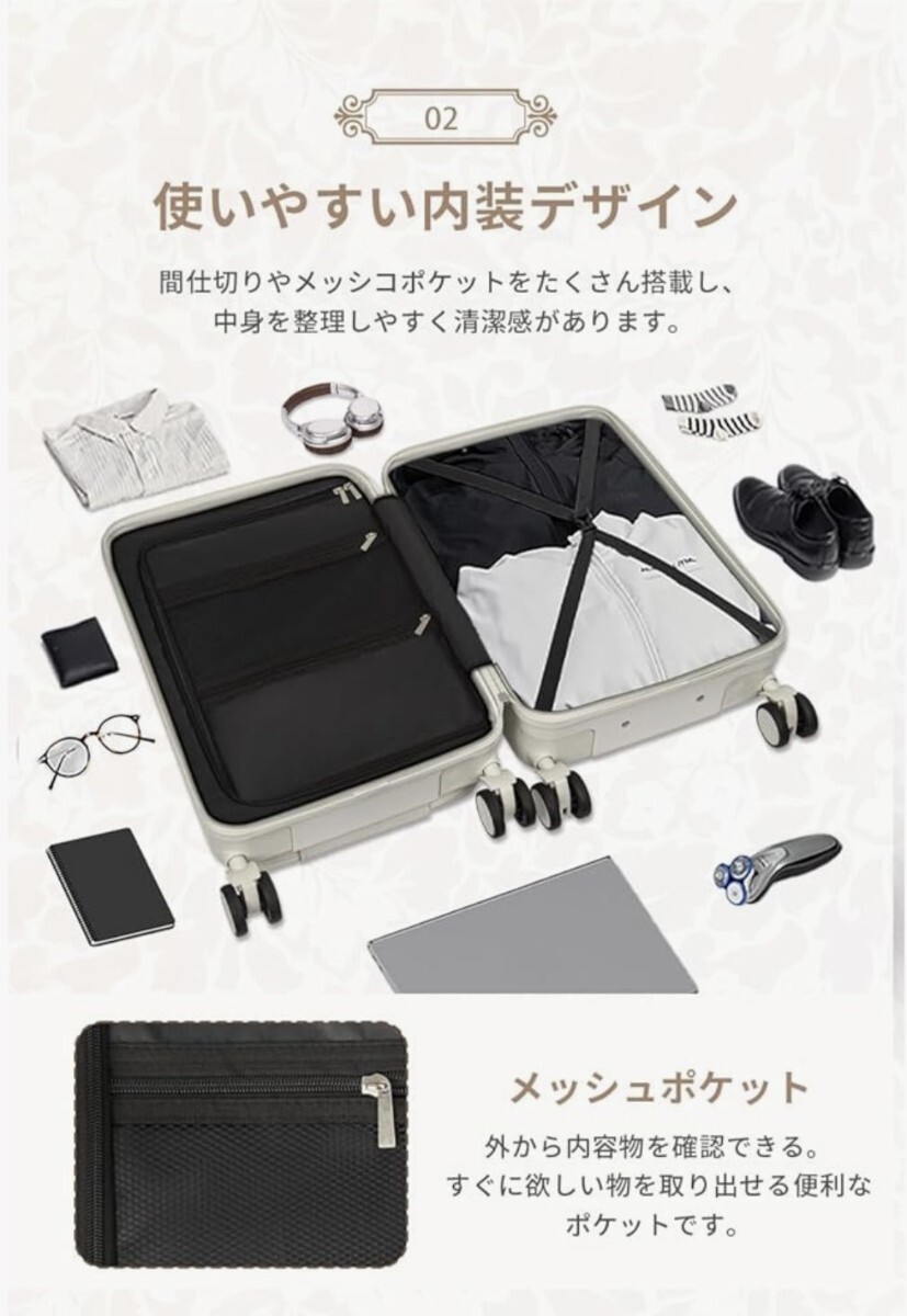 フロントオープンのスーツケースなら、旅行や出張などでたくさんの荷物を運ぶときに、立ったままでも前面のポケットから簡単に荷物を取り出せて便利です。