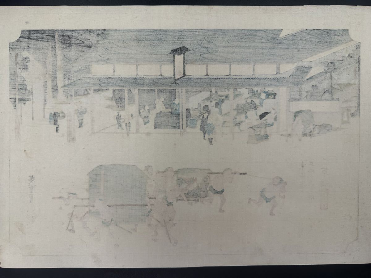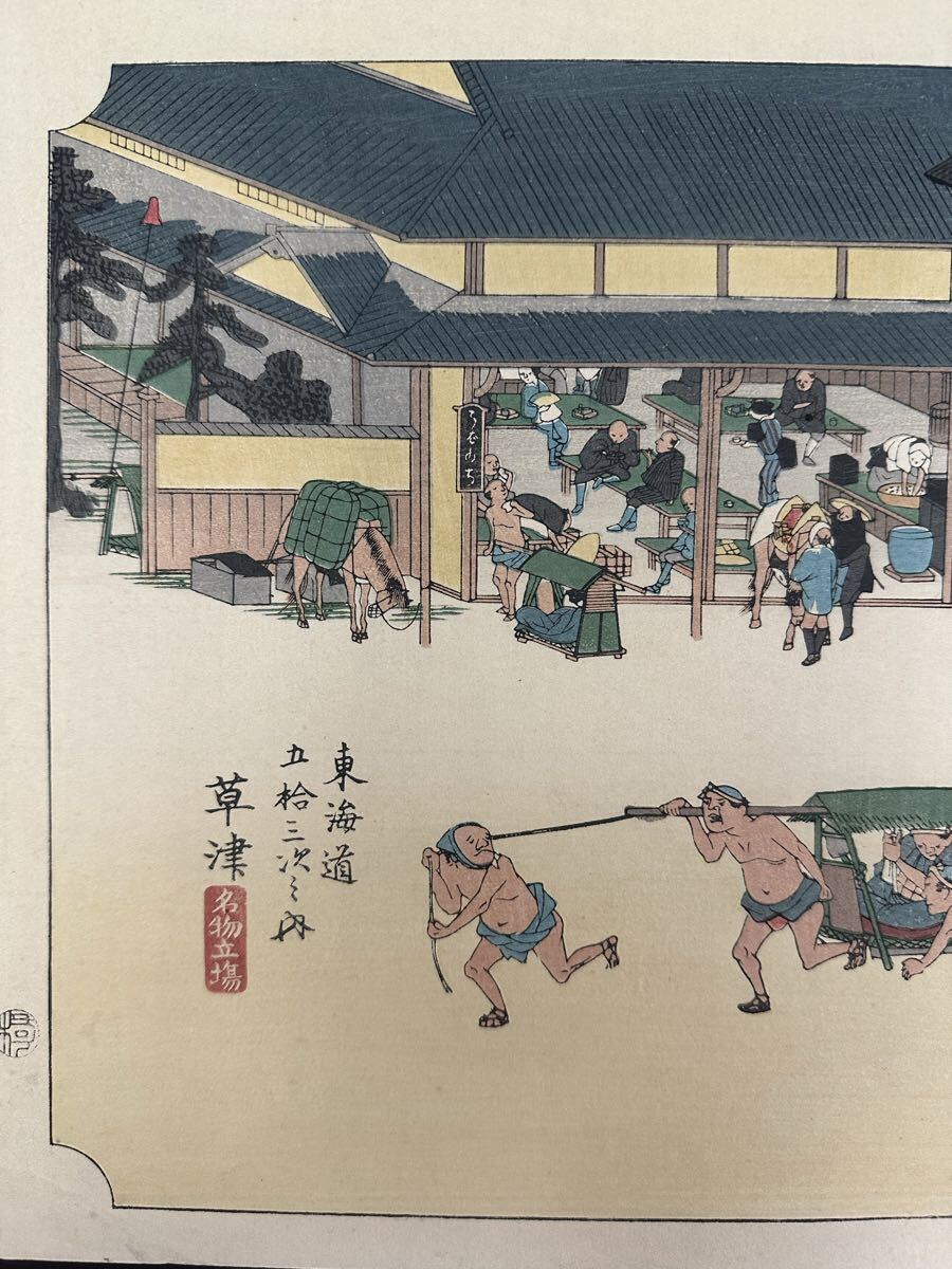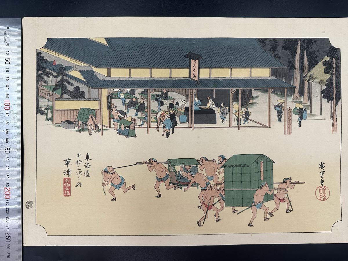 【真作】大正期 浮世絵木版画 歌川広重「東海道五拾三次之内 草津 名物立場」名所絵 大判 錦絵 保存良い