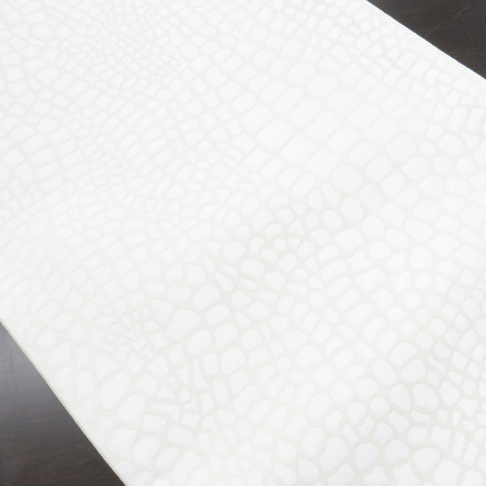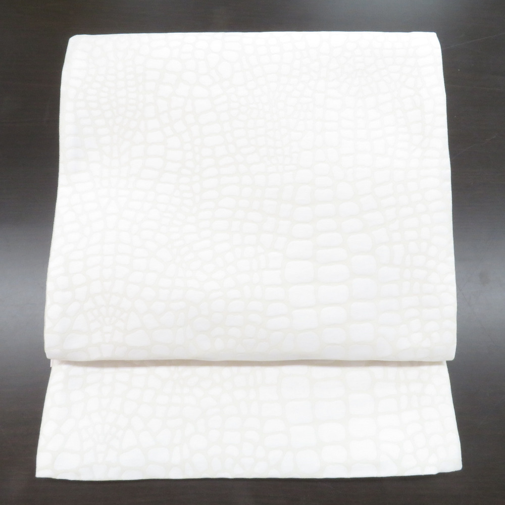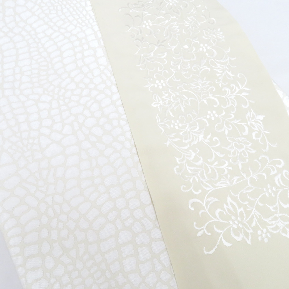 | 袋帯 刺しゅう半衿おまけ付き 振袖用 ホワイト×シルバー 型押し調 白 全通柄 ポリエステル フォーマル Freek 日本製 長さ460cm 新品 |