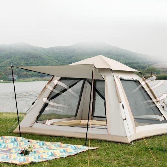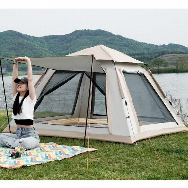 ワンタッチ式、一人でも5秒だけで簡単に設営できます、災害時の避難所などでも活躍します。製品はUVカット加工を採用しており、強い陽射しでも怖くないです。テント内側の紫外線対策はバッチリです。日差しからでも肌を守れます。