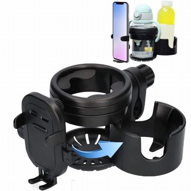 ドリンクホルダー 3-IN-1 ベビーカー ボトルホルダー カップホルダー 携帯電話収納 哺乳瓶収納 360度回転 お出かけ お散歩 丈夫 軽量