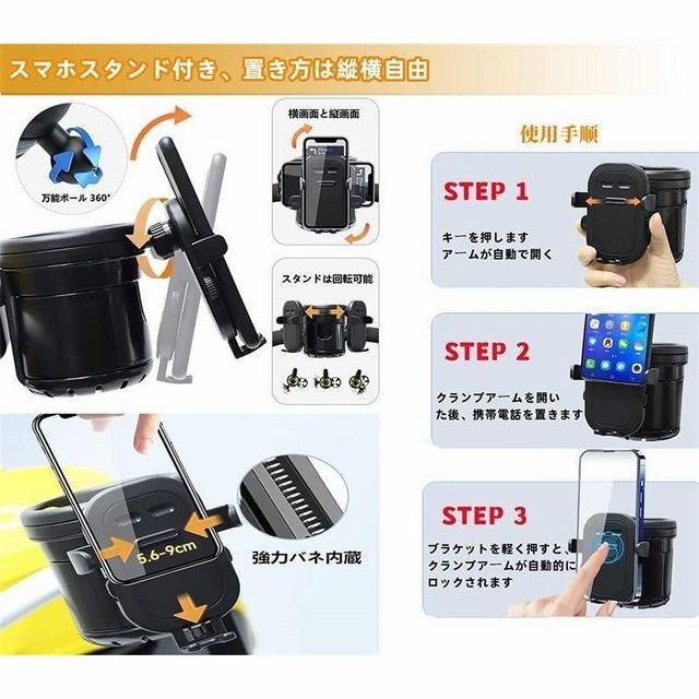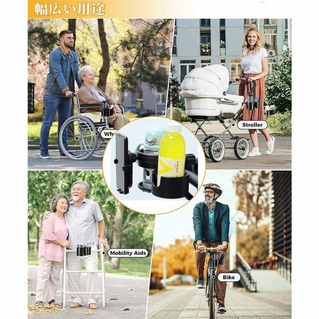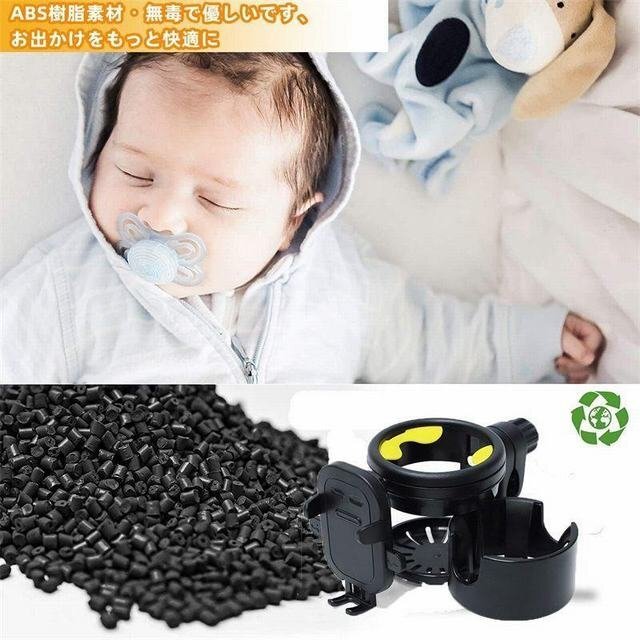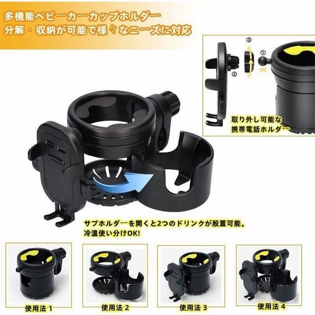 3-IN-1 ベビーカー ドリンクホルダー /重量:約340g/カラー(2色展開):ブラック/素材:ABS樹脂素材 [ホルダー仕様] メインホルダー (高さ:約11.5cm/直径(内寸):約8.5cm), サブホルダー (高さ:約5.6cm/直径(内寸)約8.5cm)  [対応ボトルサイズ] :直径約5.0~8cm。 当店ベビーカー ドリンクホルダー はエコのABS樹脂素材・環境に優しく、体に無害な素材なので、赤ちゃんが口に入れたとしても問題ありません。また軽量で十分な強度があり、使い心地が良く耐久性があります。 ベビーカーを押しながら、お散歩やお買い物をする時に、バックから飲み物を出し入れする手間が省けます。ドリンクホルダーを利用することで、両手が解放され、お子様とのお出かけをより安全に快適にします。 メインホルダーとサブホルダーがあり、使わない時は1つに収納。様々なサイズのドリンクをシリコンストッパーで固定します。スマホスタンドもあり、移動中もスマホを自由に使えます。クリップが360°回転し、縦・横自由に置けます。