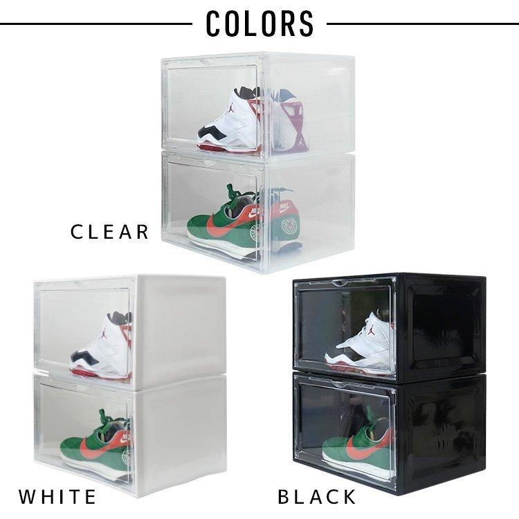 お気に入りのスニーカーをディスプレイして楽しめるシューズボックスです! メンズサイズやバスケットシューズ等のハイカットも靴にも対応!! 扉付き!クイック開閉!! 前扉にはマグネットがついており、開け閉めがスムーズです。 狭いスペースでもOK!スタッキングできます♪ 付属のパーツを使用することにより、倒れにくく安全に積み重ねて収納できます。 汚れたら濡れ布巾でサッと拭き取ればキレイ! 頑固な汚れには、丸ごと水洗いOKです! その他、キャップや雑貨、衣類などの収納や フィギュアやぬいぐるみのコレクションケースとしても使えます☆ 【商品仕様】 カラー:ブラック サイズ(外寸):(約)幅36×奥行き28×高さ22cm (内寸):(約)幅34.5×奥行き27×高さ21cm 材質(本体):ポリプロピレン (扉):ポリスチレン 【商品内容】 ディスプレイボックス ×3個 |