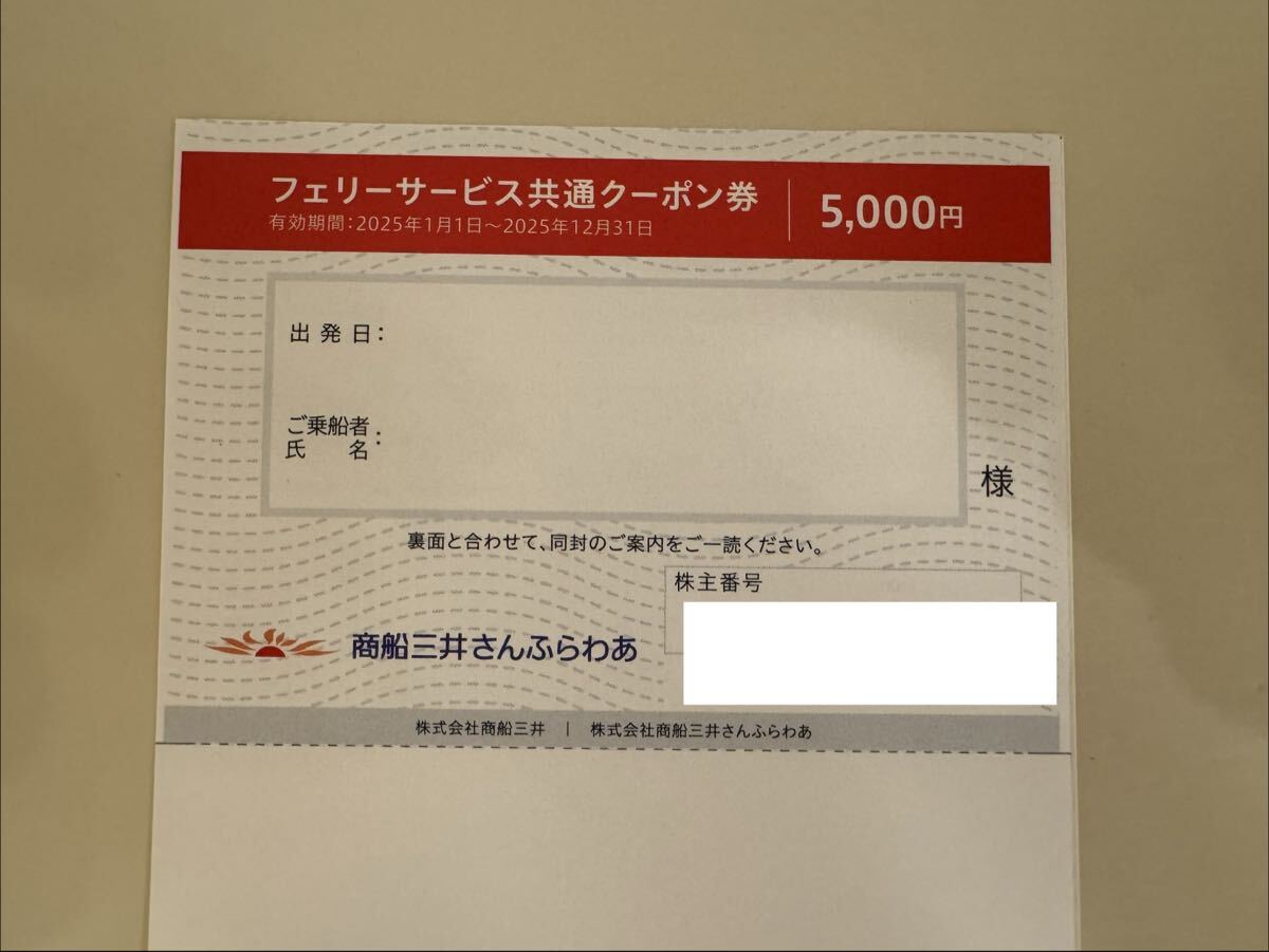 株式会社商船三井の株主優待で、フェリー共通サービスクーポン券5000円割引券です。 商船三井フェリー株式会社、株式会社フェリーさんふらわあのフェリー共通サービス券です。ただし、貨物運賃及び法人料金には適用外です。 フェリーの旅客運賃のお支払い時にご利用いただけます。