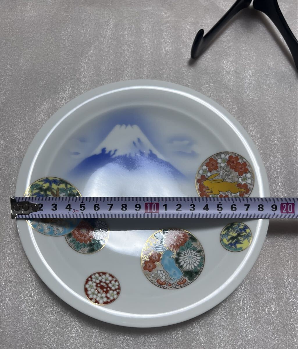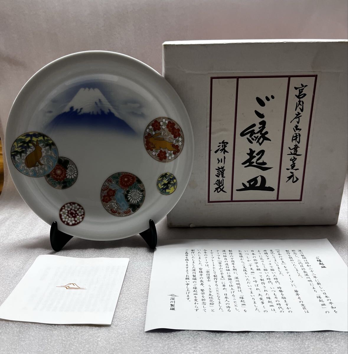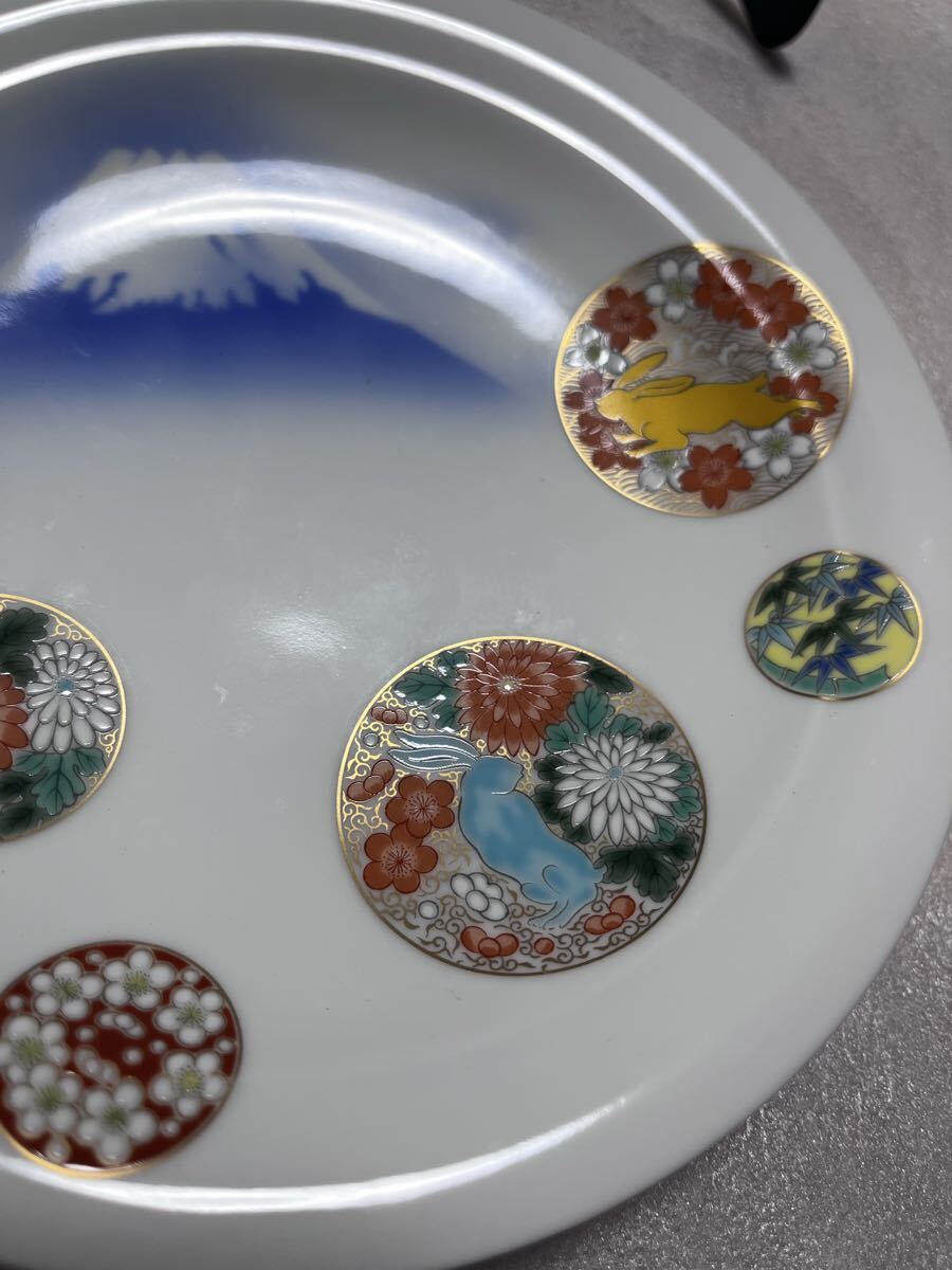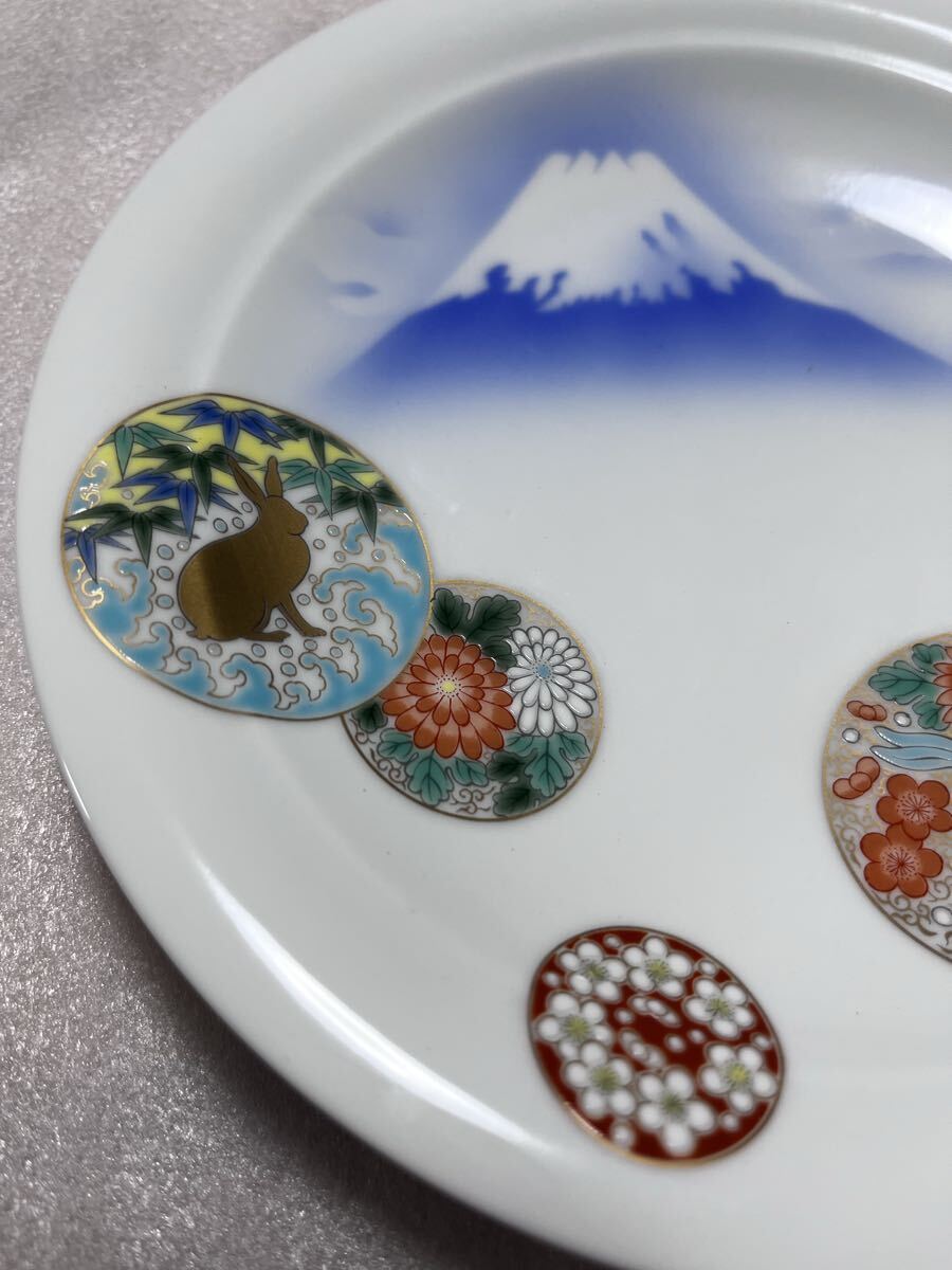 未使用 有田焼 深川製磁 ご縁起皿 縁起 卯 2011年 染付富士 うさぎ丸紋 花絵 飾皿 絵皿 うさぎ 金彩