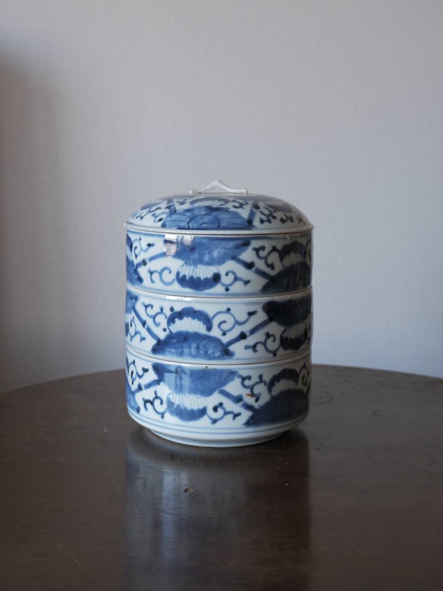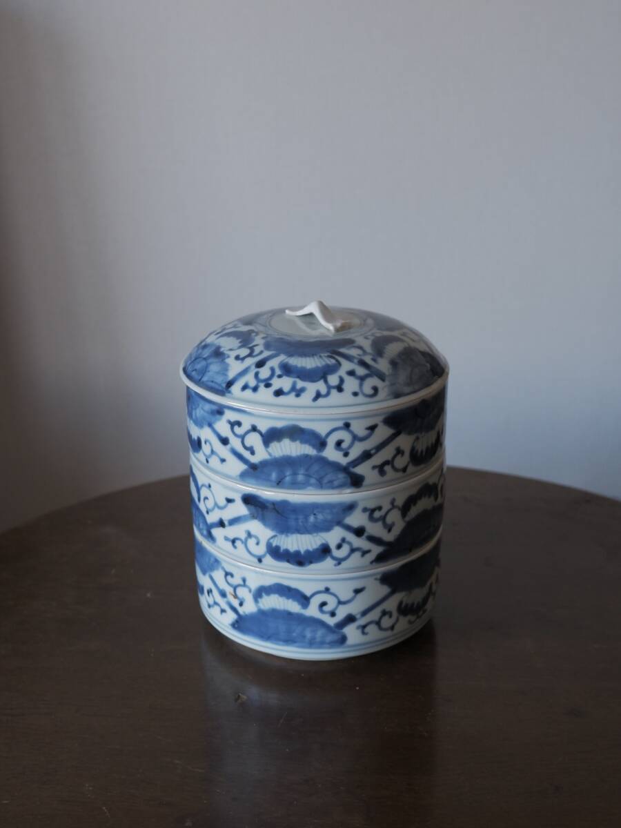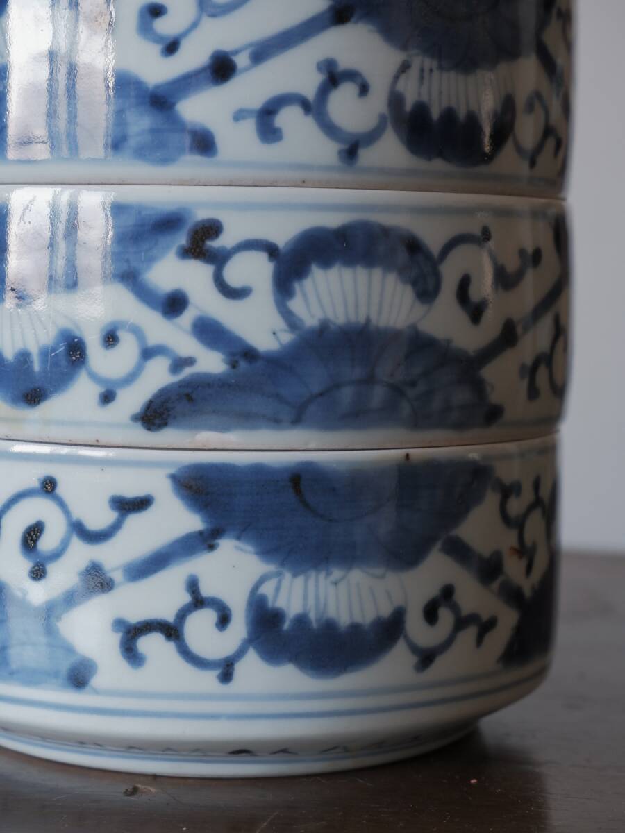 【青枠】伊万里焼 染付 三段重 重ね鉢 菓子器 和食器 花柄 陶磁工芸 時代物 美術品Q1977