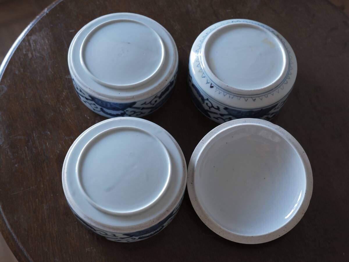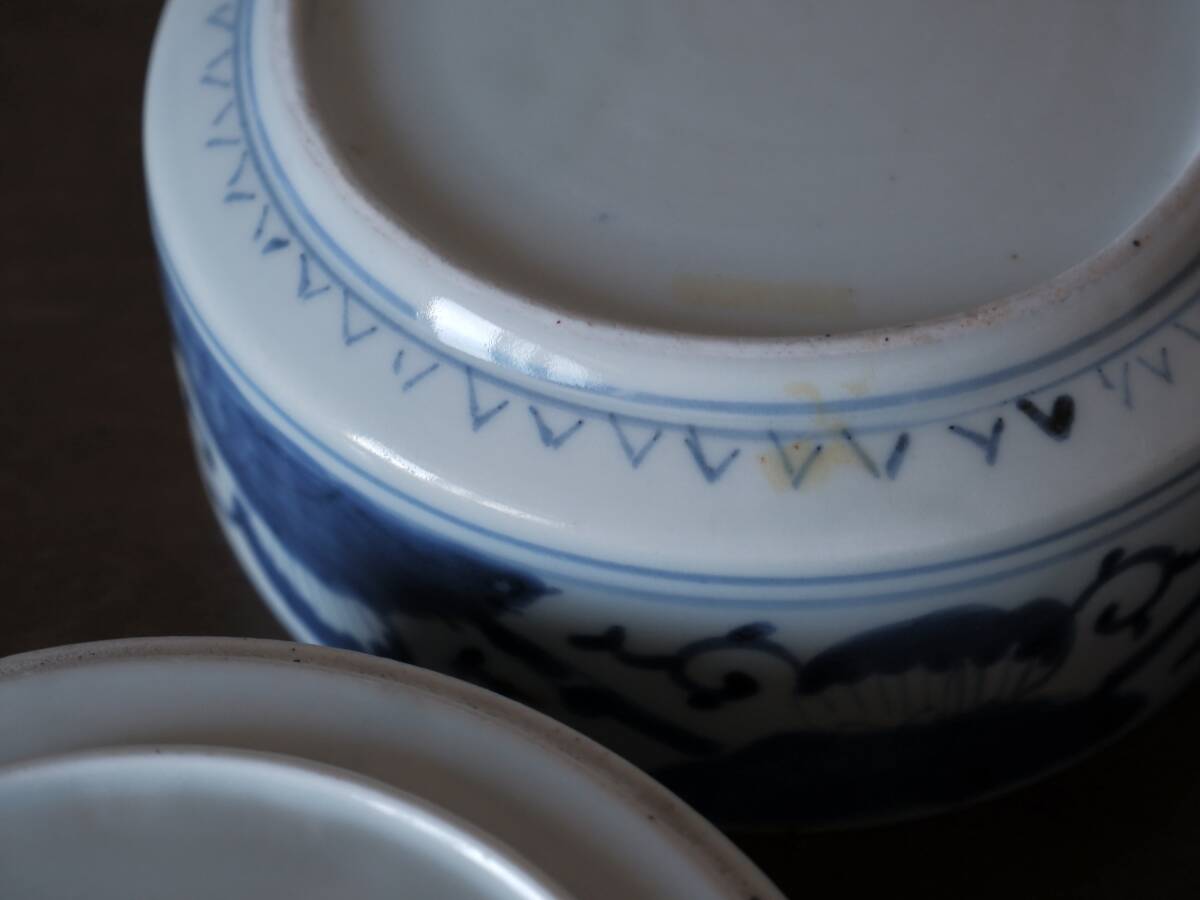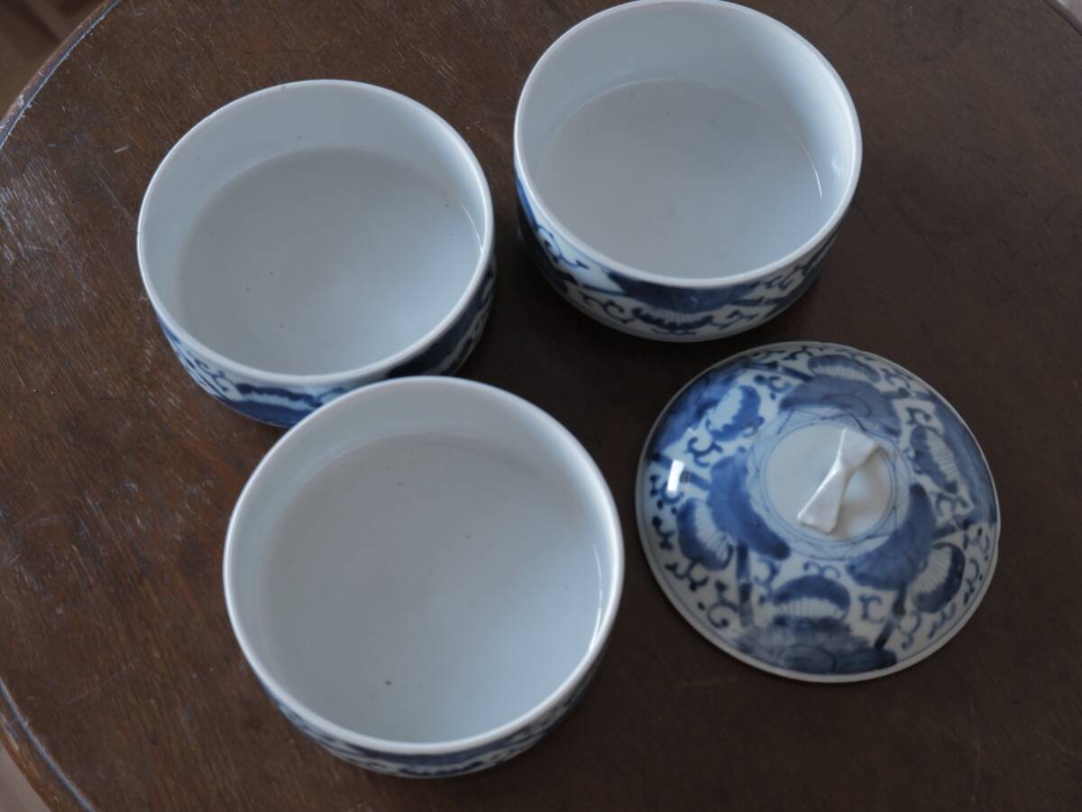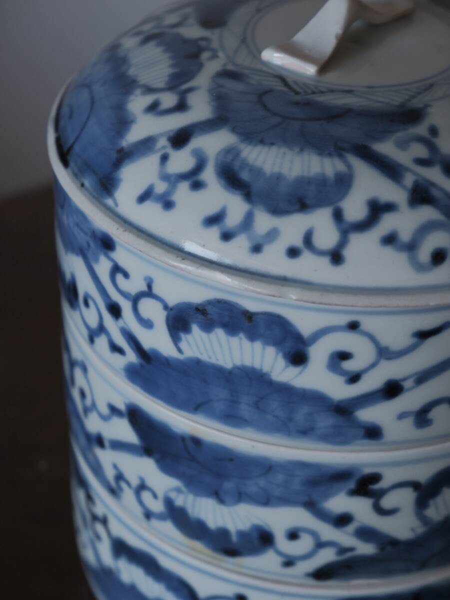 【青枠】伊万里焼 染付 三段重 重ね鉢 菓子器 和食器 花柄 陶磁工芸 時代物 美術品Q1977