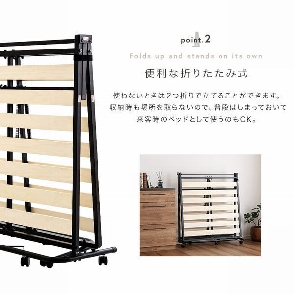 折りたたみパイプすのこベッドシングルサイズ! 使わない時は2つに折りたたむことが出来、キャスター付きなのでそのまま移動させることもできます。 すのこ部分にはポプラ合板を使用しているので、通気性もよくダニやカビの防止にもなります。 |