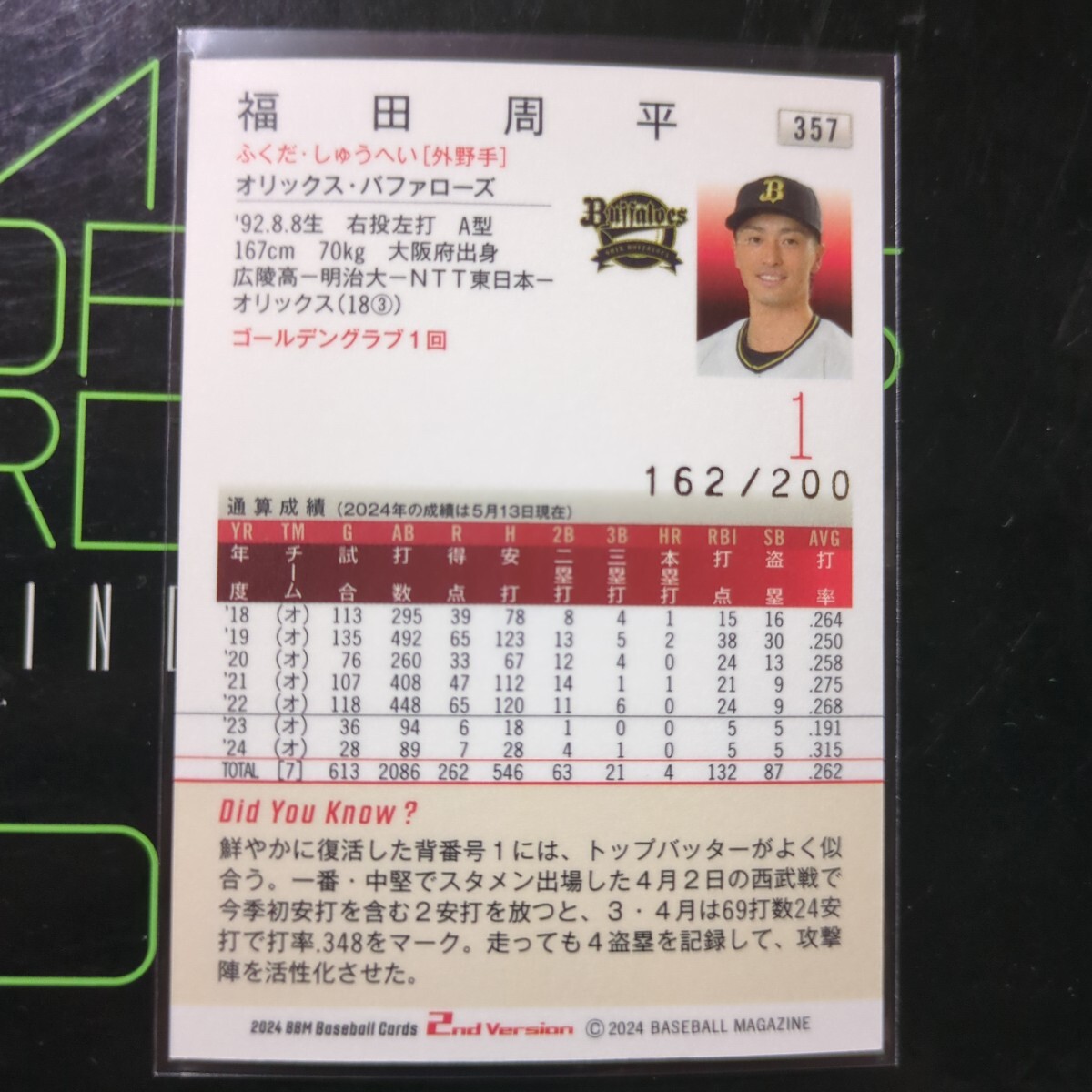福田周平 BBM 2024 2nd オリックス・バファローズ レギュラーカード パラレル 357 200枚限定