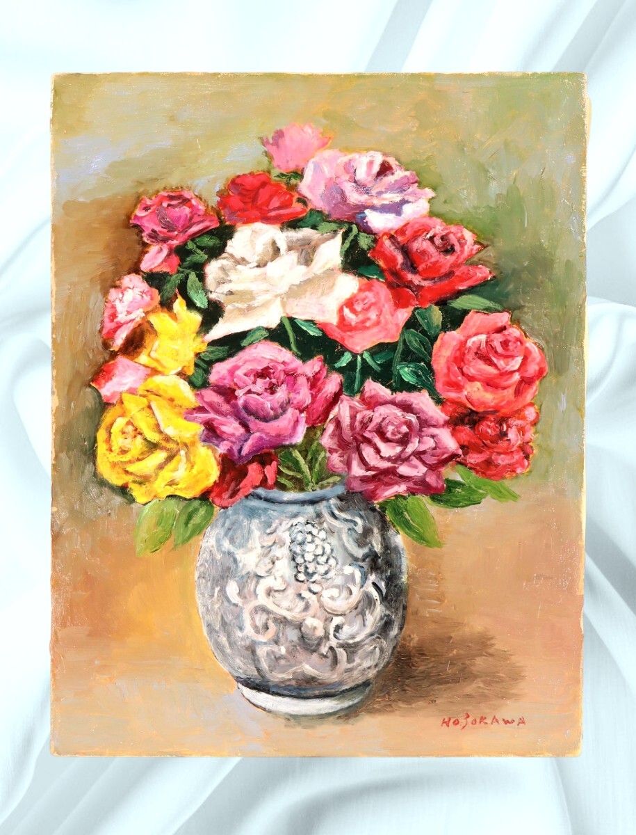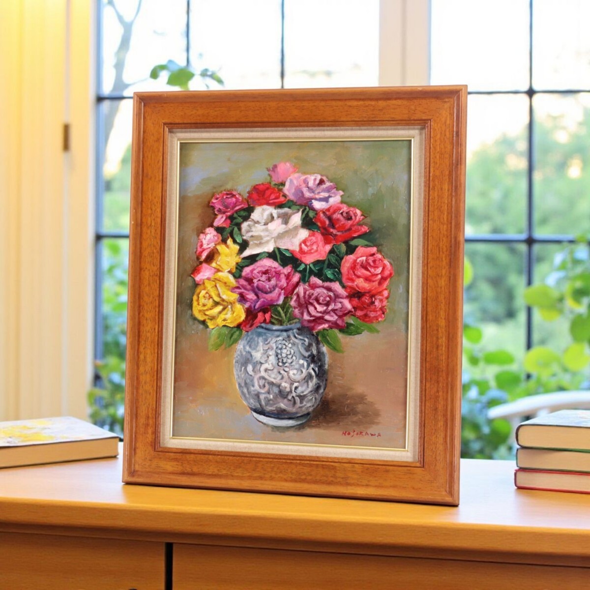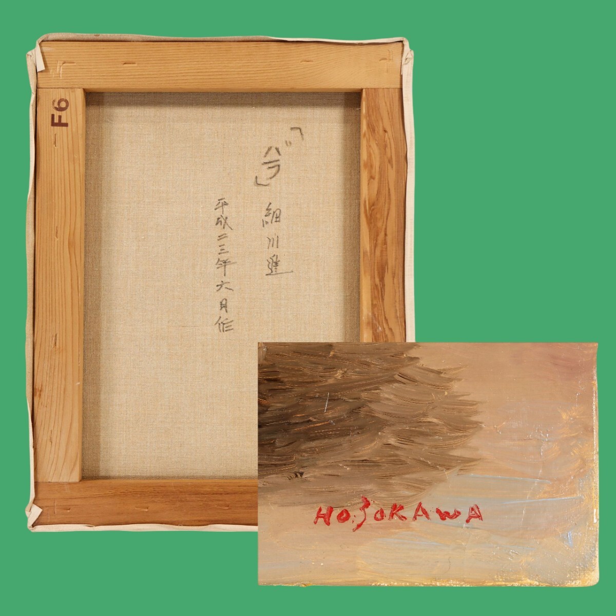 真作 細川進 2011年油彩「バラ」画寸 F6 愛媛県出身 元陽会委員 坂本牙城に師事 豊かな色彩と立体感が印象的 静けさと華やかさが共存 11581