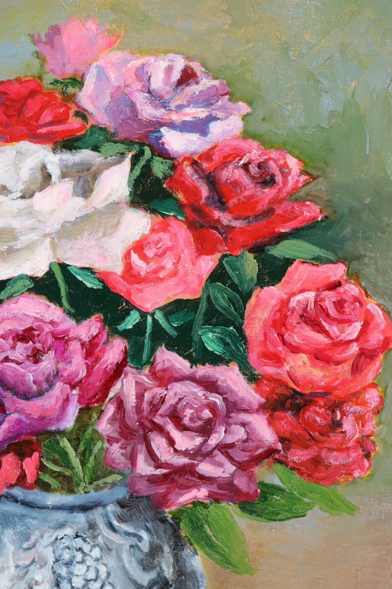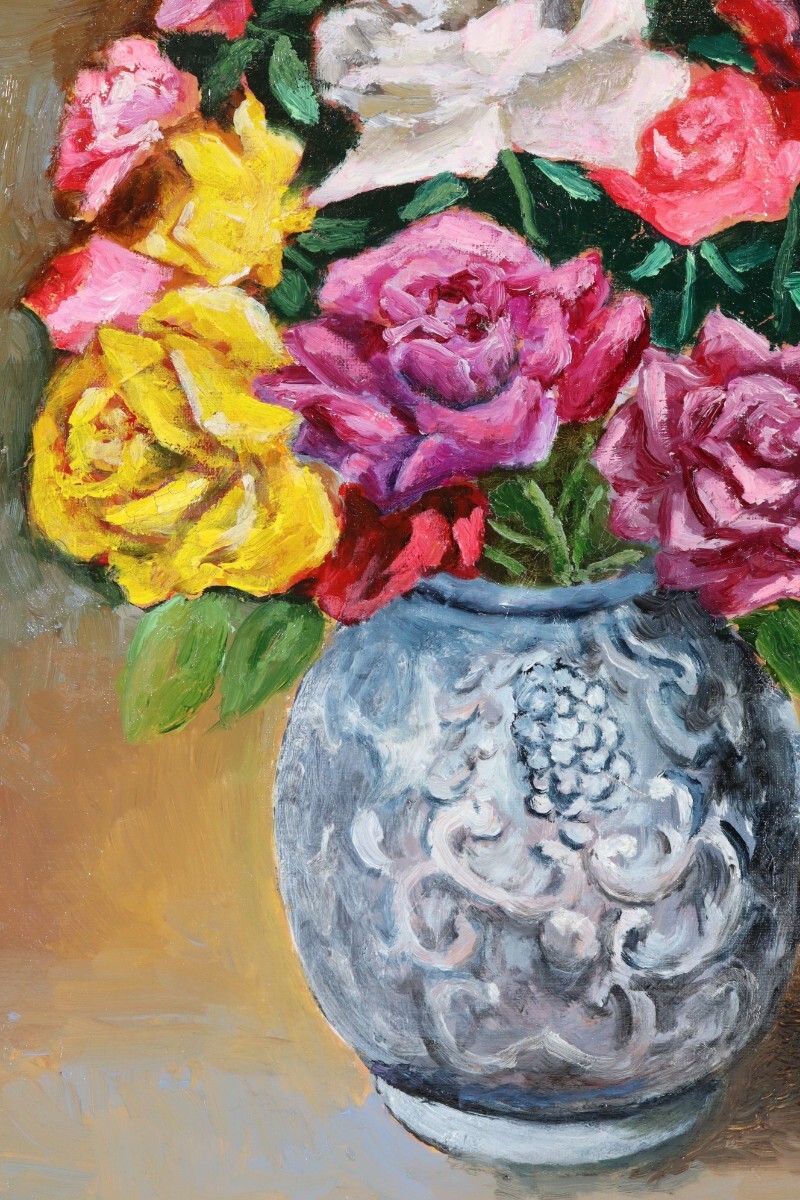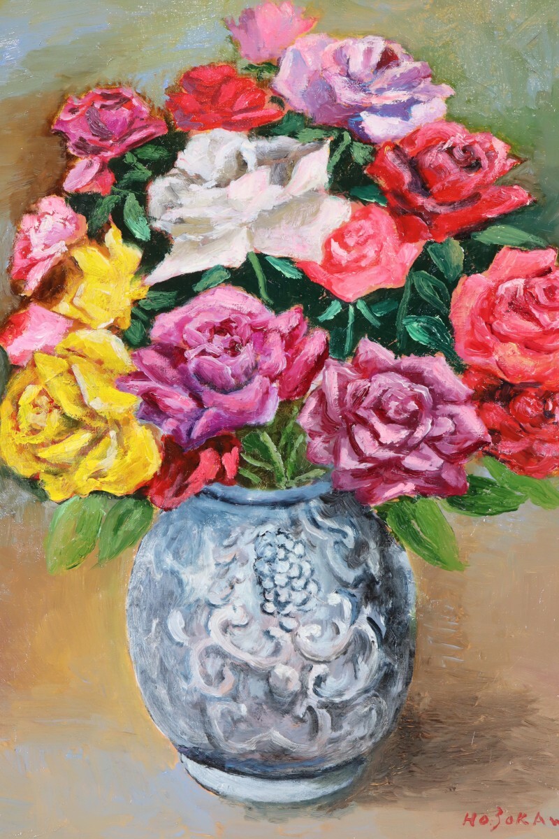 真作 細川進 2011年油彩「バラ」画寸 F6 愛媛県出身 元陽会委員 坂本牙城に師事 豊かな色彩と立体感が印象的 静けさと華やかさが共存 11581
