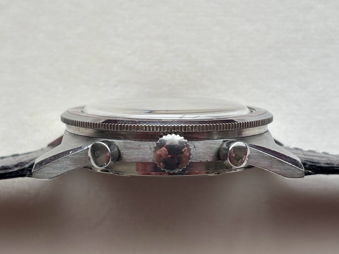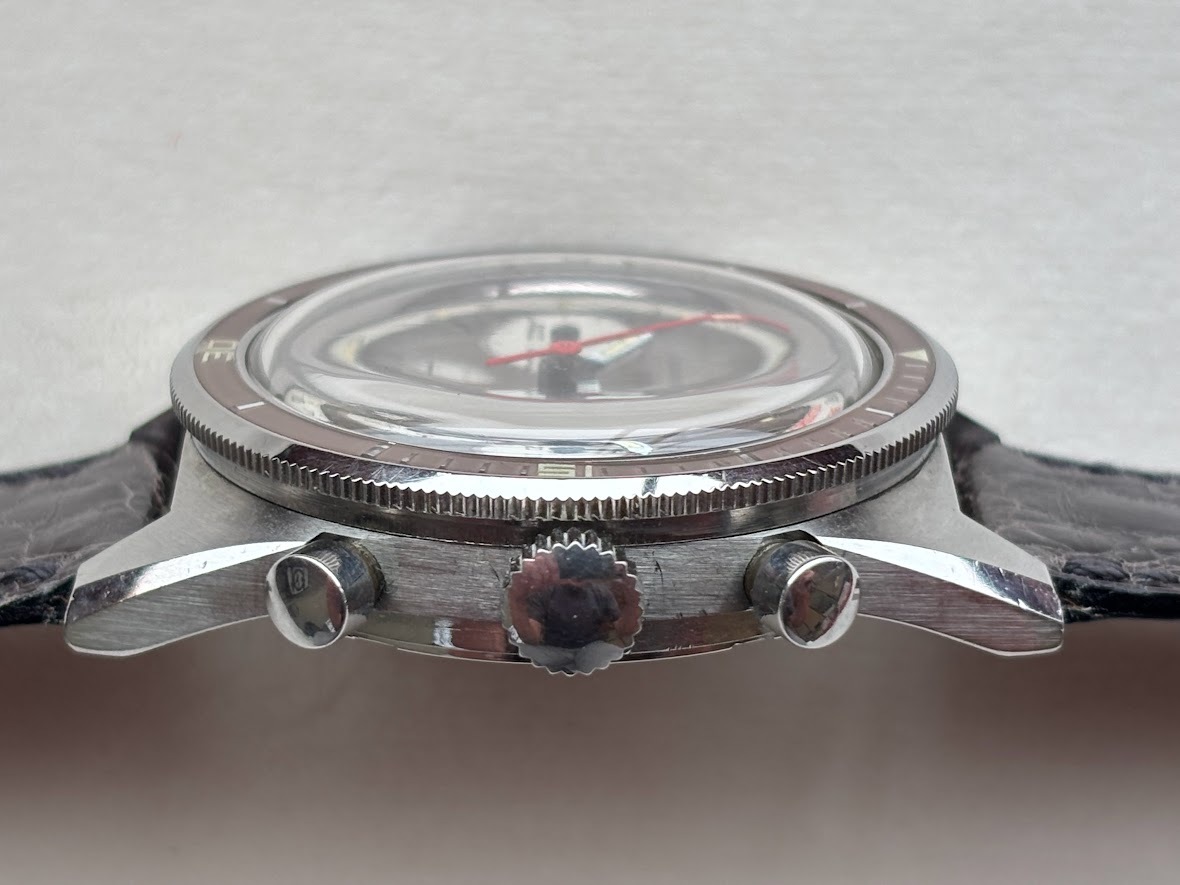 ひび割れのないベークライト製のベゼル、美しく保存された凸型夜光ドット、レッドとブラックのバイカラースケール、マットホワイトのスモールダイアル、ベゼルやダイアルのオシャレなグレージュ色、それらの調和がこの時計を際立ったデザインに仕立て上げています。