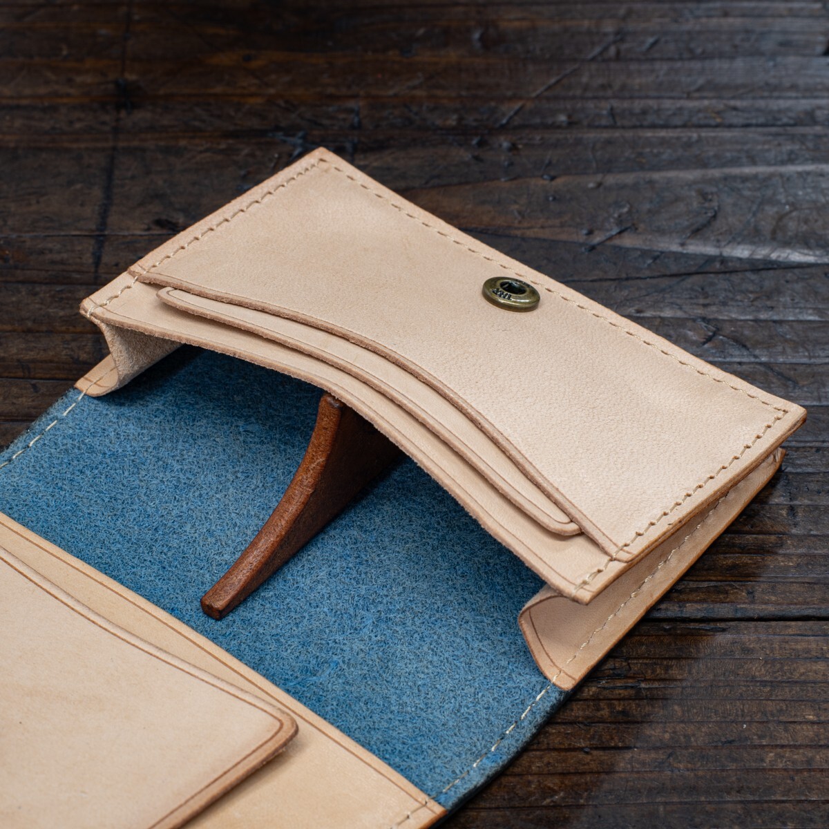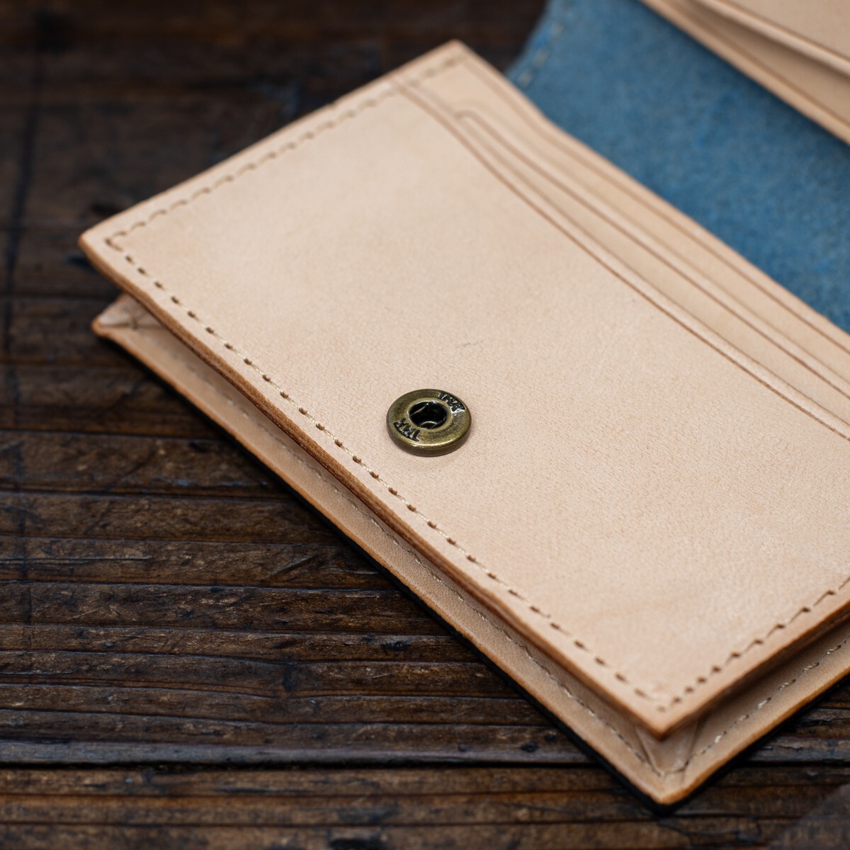 縁まわりはコバを丁寧に磨いて仕上げており、見た目のきれいさだけでなく、革の断面からの劣化も防いでいます。ホックには阿部ハトメ社製の「THKホック」を使っていて、バネがへたりにくく、しっかり留まる安心感があります。