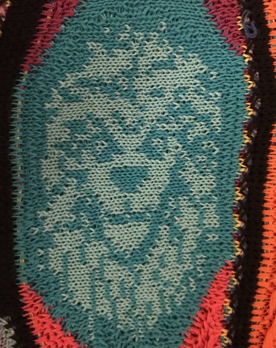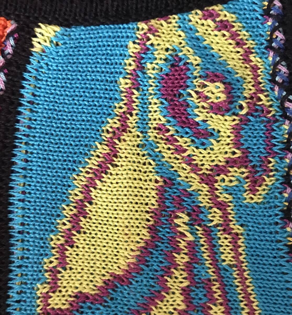 前背面で全く異なる配色や珍しくも絶妙に効いたリブの編み込み等、クージーの底知れぬセンスが光ります。