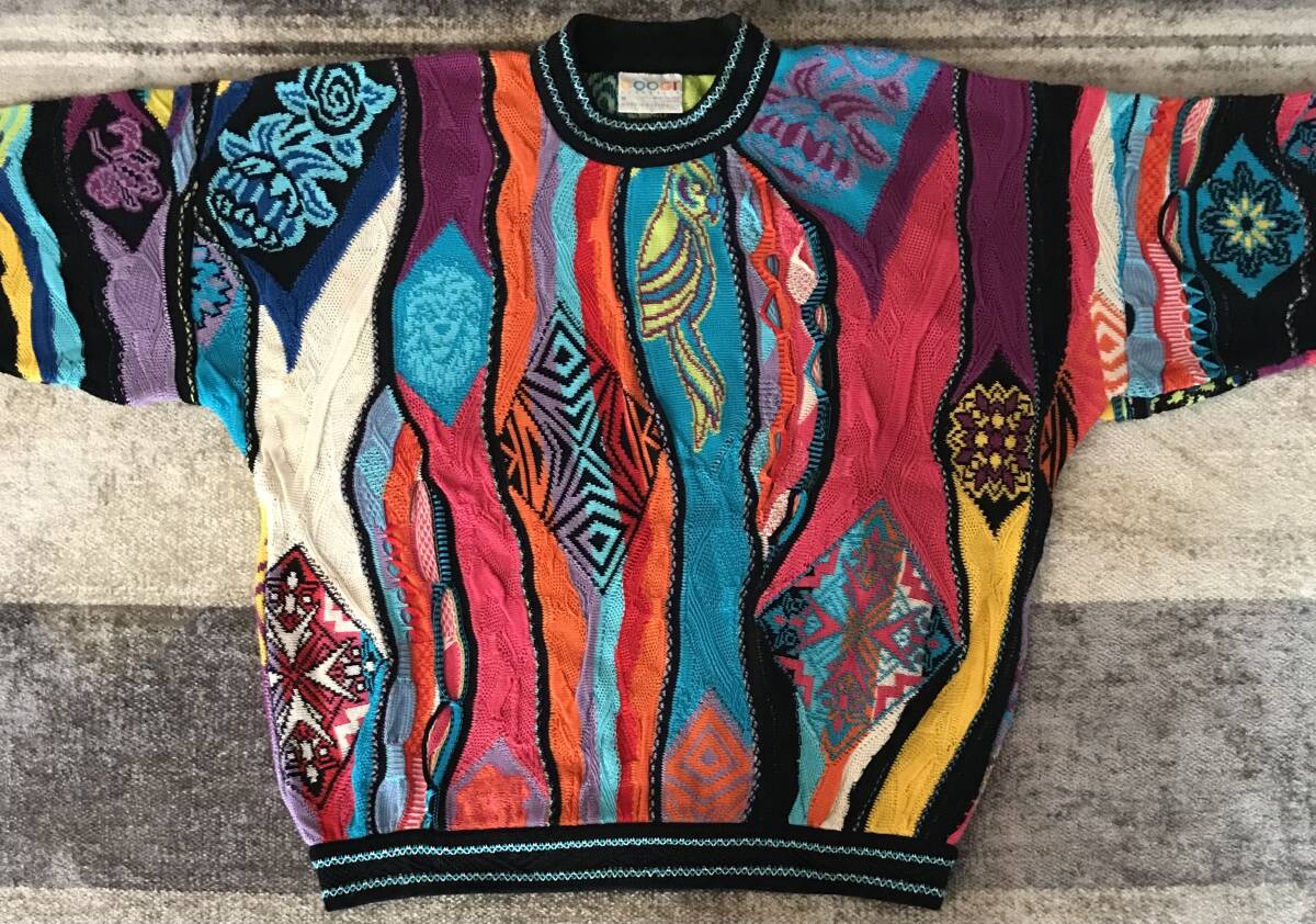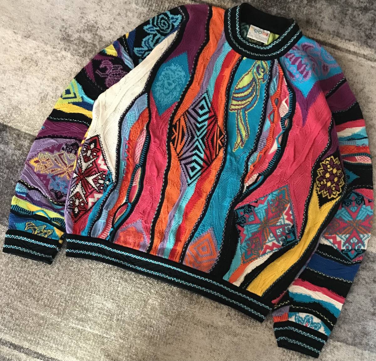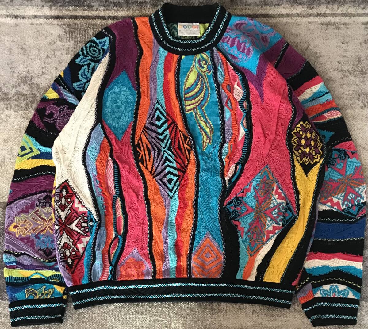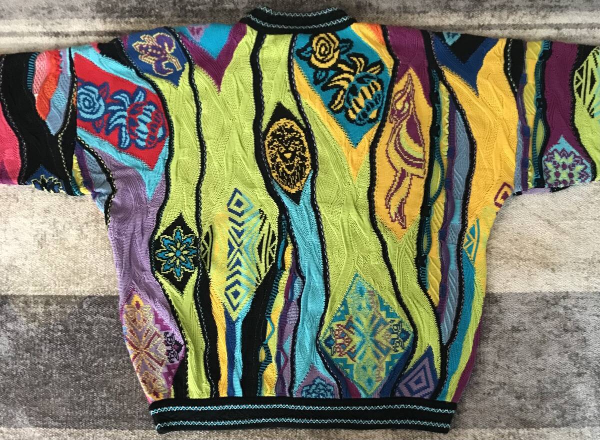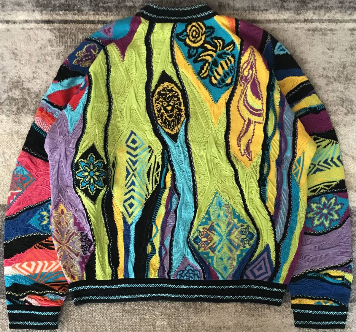 幻の逸品 BIG SIZE 芸術 最高傑作 異次元のセンス 90's vintage ★ COOGI AUSTRALIA ★ クージー オーストラリア 鳥 オウム バード ライオン 薔薇 花柄 幾何学模様 3D 立体 個性派 ド派手 カラフル コットン ニット セーター M です。