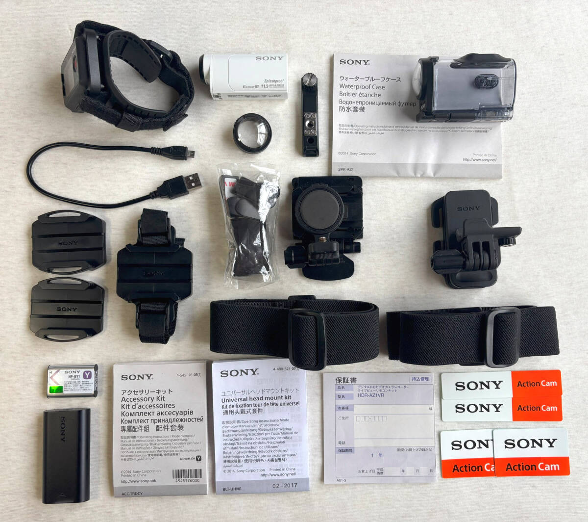 標準付属品:HDR-AZ1本体、ライブビューリモコン、リチャージャブルバッテリーパック(NP-BY1)、マイクロUSBケーブル、ウォータープルーフケース(SPK-AZ1)、接着式マウント、三脚アダプター、取扱説明書、保証書