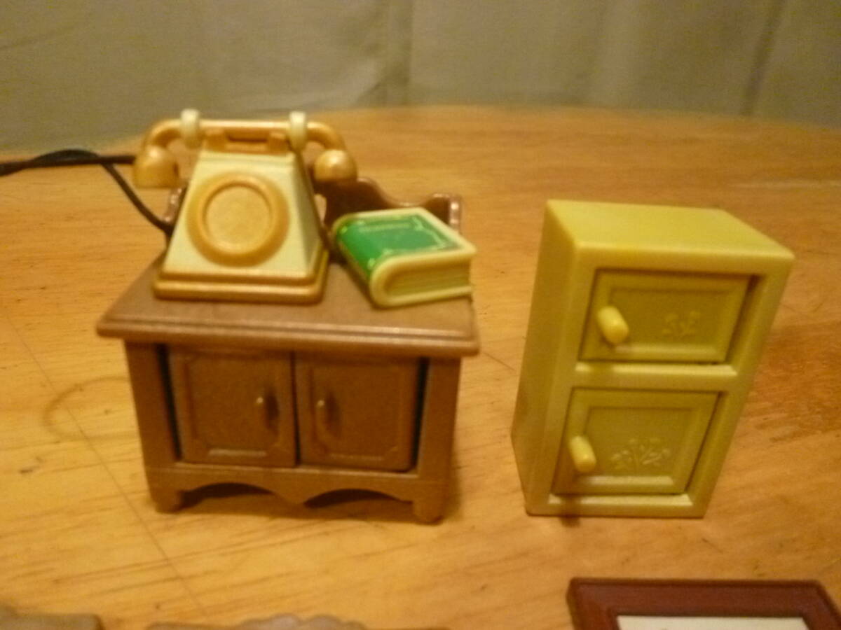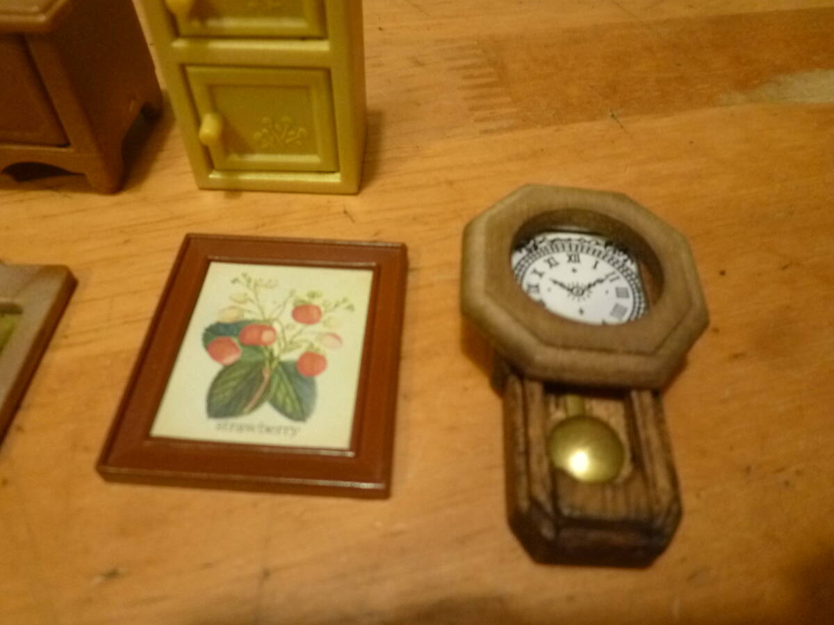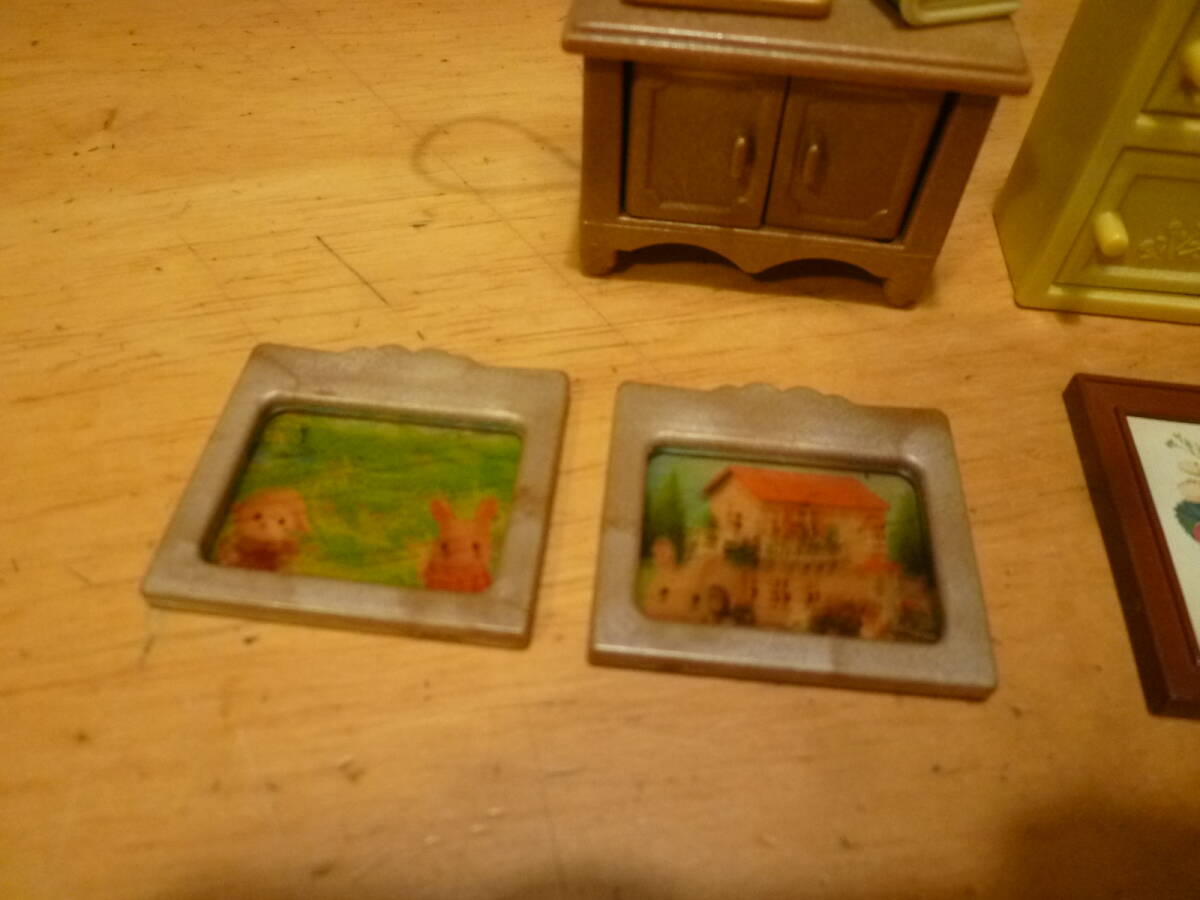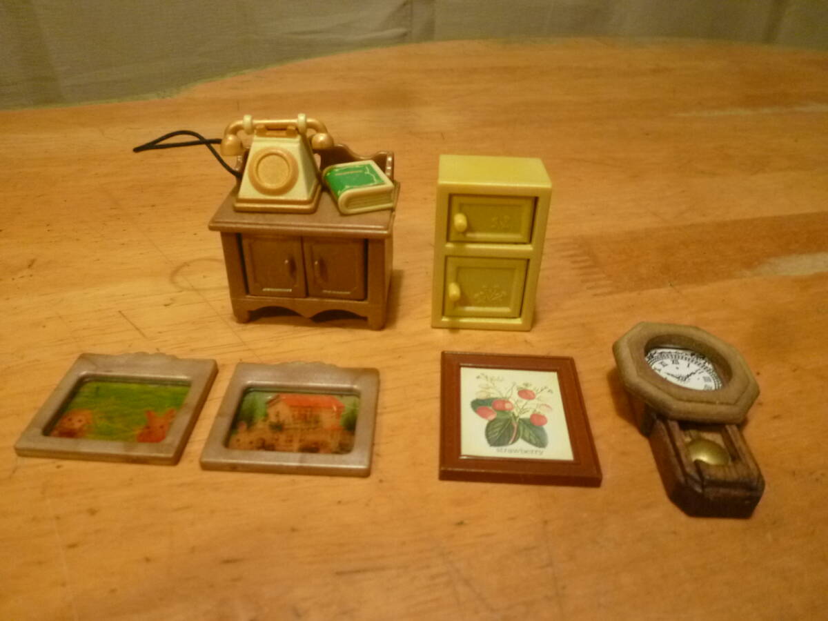 こちらは女の子が大好きなシルバニアファミリーの室内用小物セットになります。セット内容は当方の判断でとなり、固定式の電話と台上には電話帳?も、小型のドア付小物入れ・柱時計と額縁や旧式テレビの画面(横3・7×3・5cmくらい)2枚となっています。