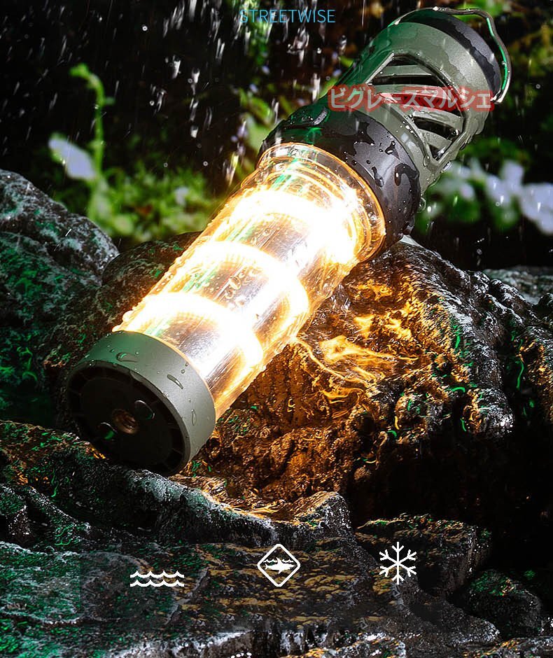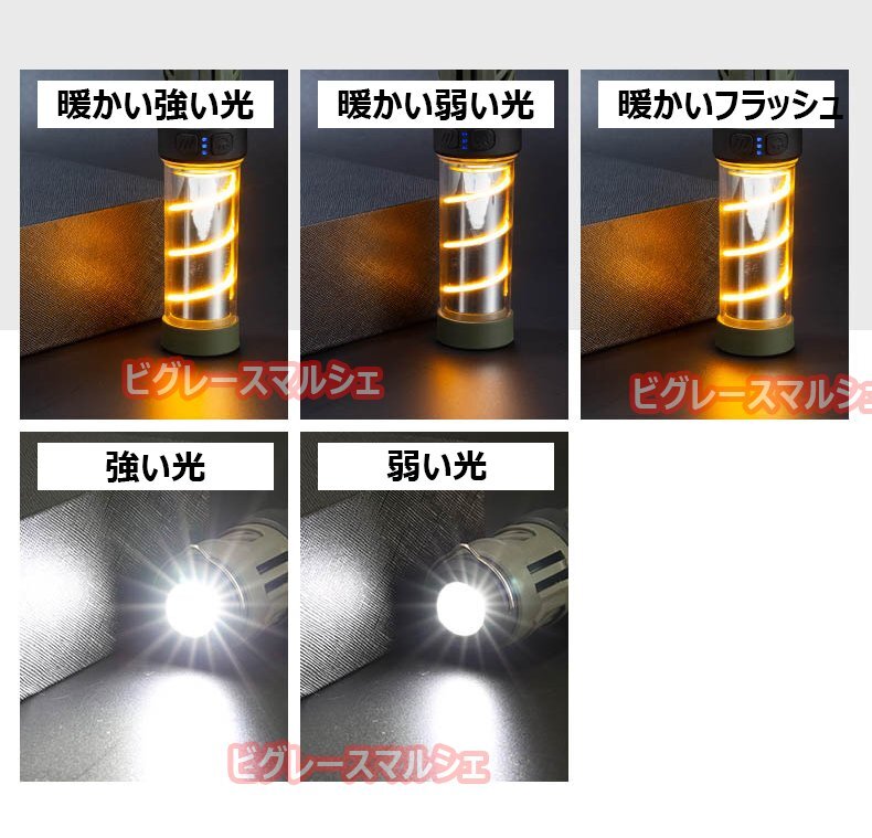 【ギア】: キャンプライトモード: 暖かい強い光、暖かい弱い光、暖かいフラッシュ、懐中電灯モード: 強い光、弱い光