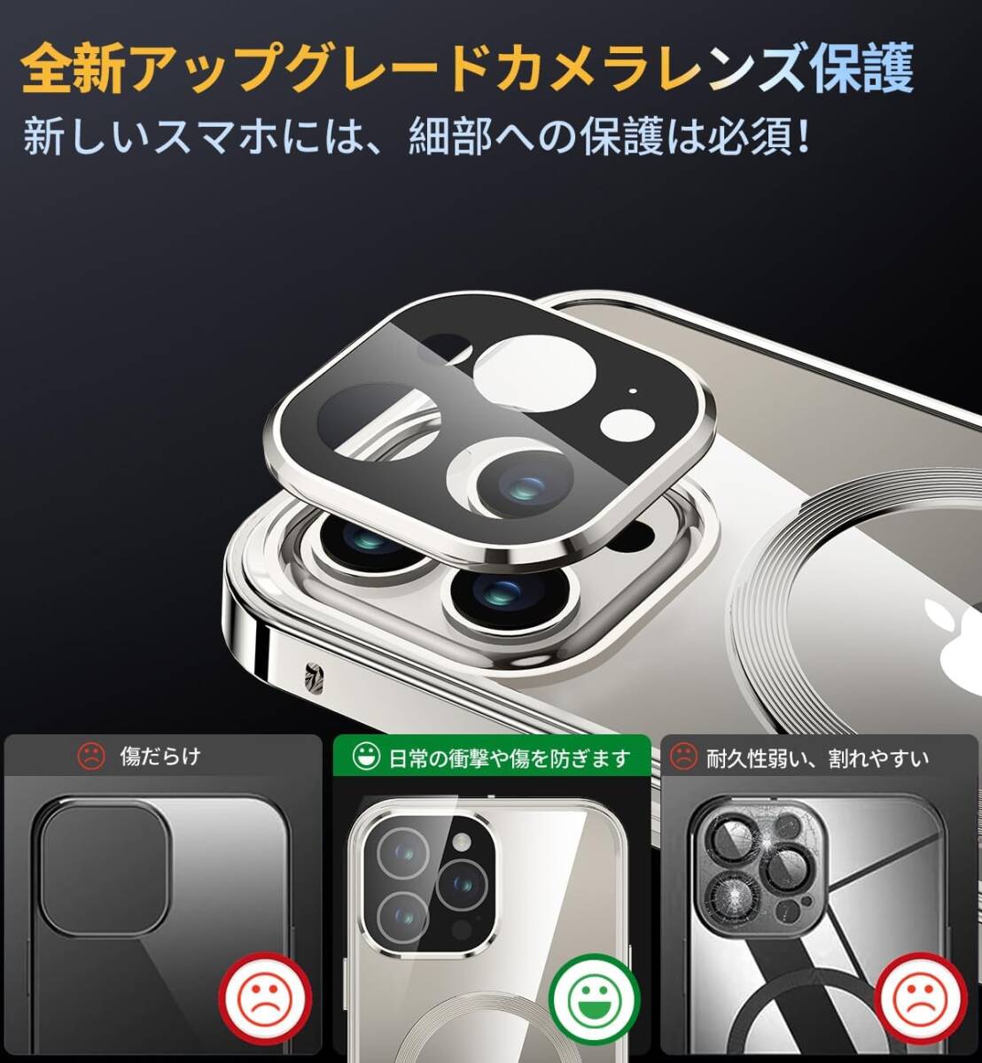 【ロック機能付き・アクションボタン・1秒で取り付け】革新的な技術、このアイホン16 Pro ケースは上部にアクションボタンのロックでケースの前後パーツをしっかり固定、万が一落下してもケースが分離せず、携帯がケースから飛び出す心配ないです。上部のアクションボタンを押すだけで、ロックの解除も簡単、ケースを簡単に取り付けできるのが便利です。注意:取り付けるとき、後カバーと前カバーの底部が位置合わせされ、ぴったりとフィットしていることを確認してください。