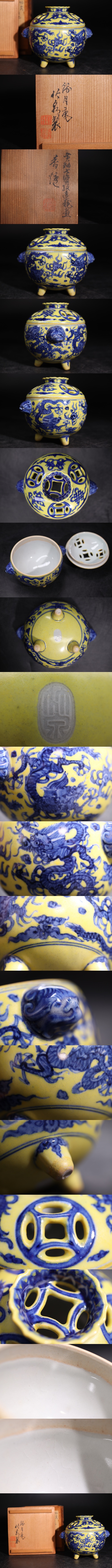 | 初代 三浦竹泉 造 篩月庵 黄釉 双龍文 香炉 共箱付 / 竹泉 京焼 名工 香道具 煎茶道具 .G2759 |